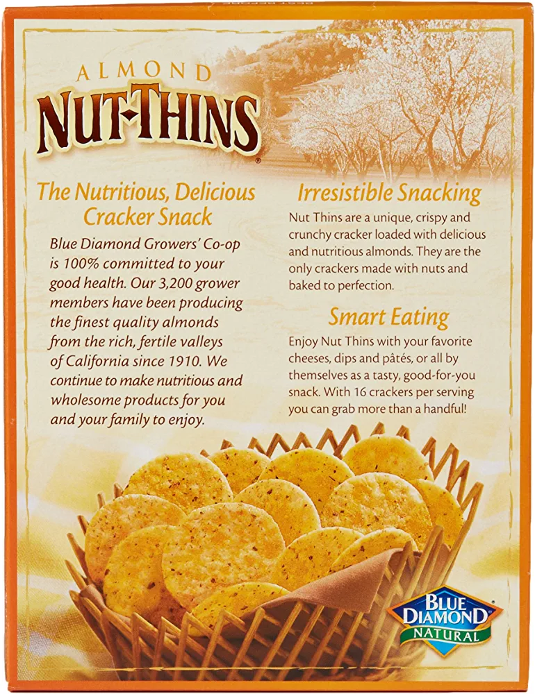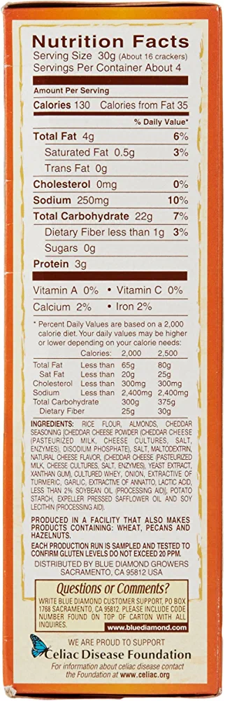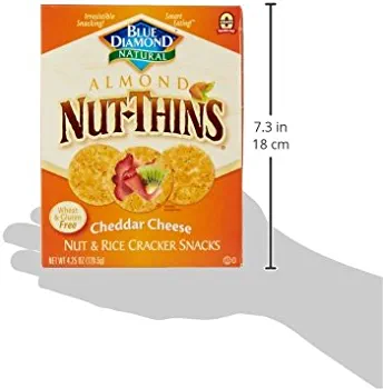 | nameOriginal | Blue Diamond Almond Nut Thins, Cheddar Cheese, 4.25 Oz |