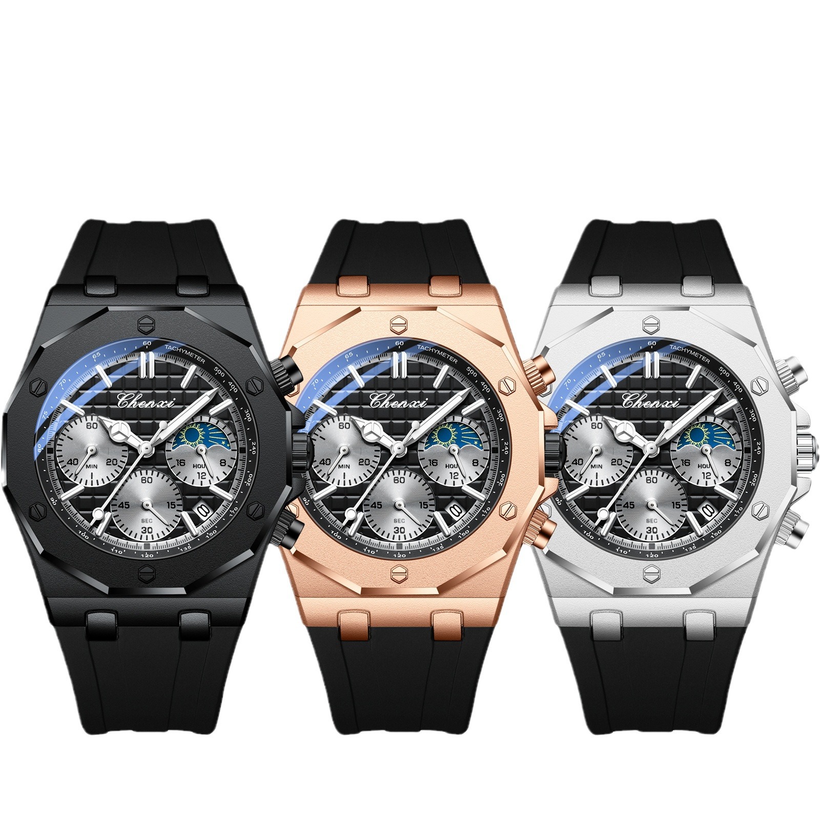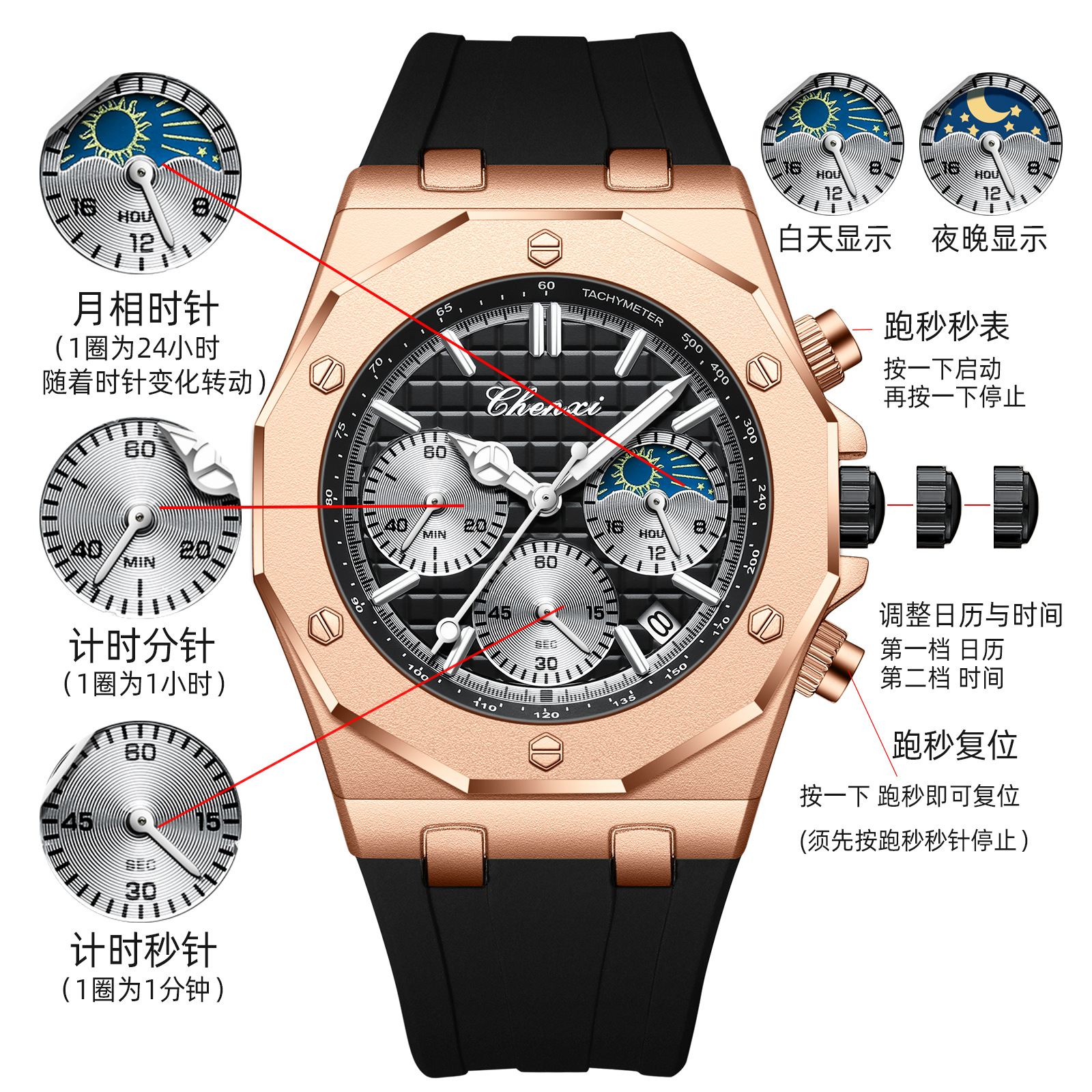 | nameOriginal | Chenxi multi-function watch men's watch three-eye six-pin cross-border live source manufacturer silicone calendar waterproof quartz |