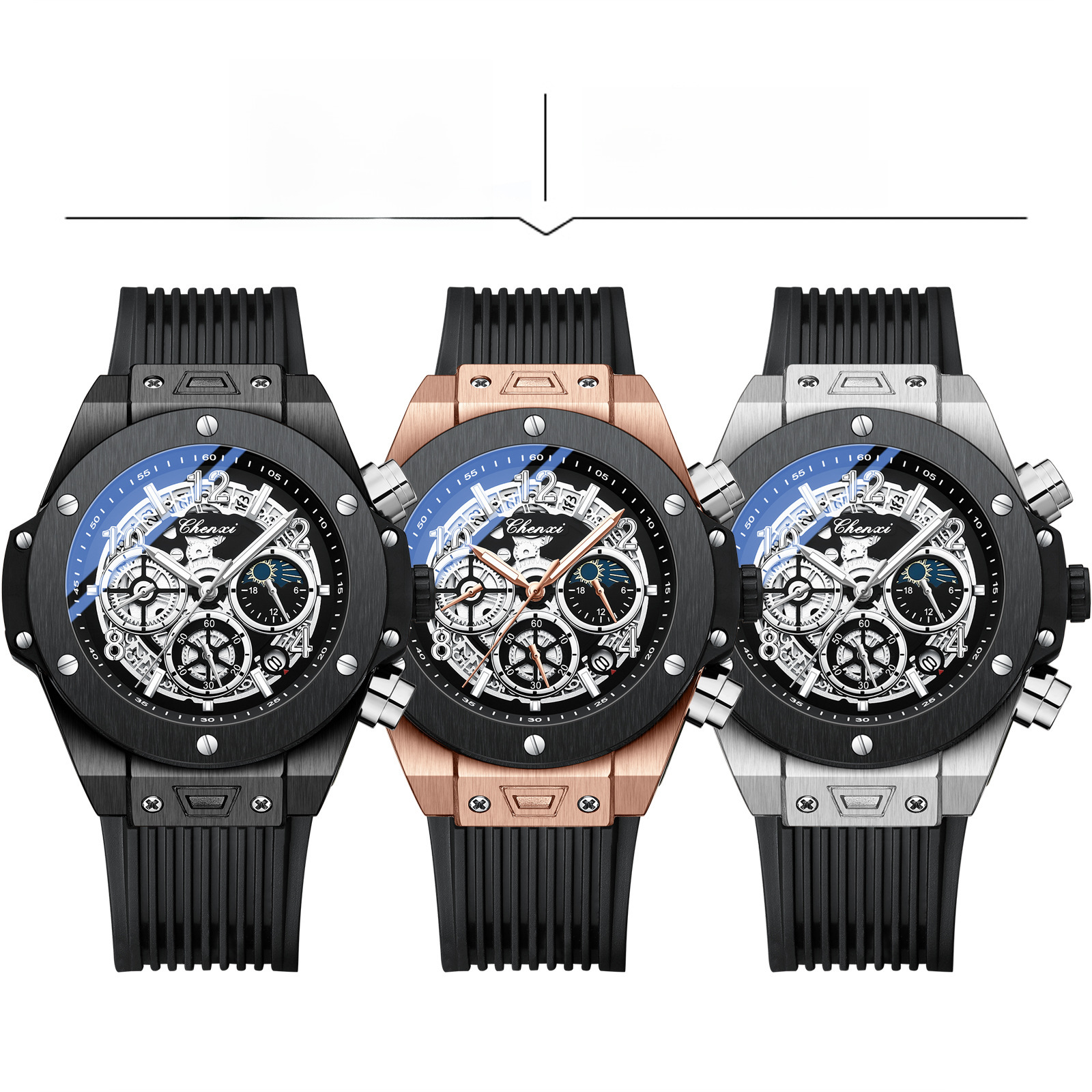 | nameOriginal | Chenxi multi-functional cool men's watch geometric rivet Moon Phase Timing luminous foreign trade cross-border live quartz watch |