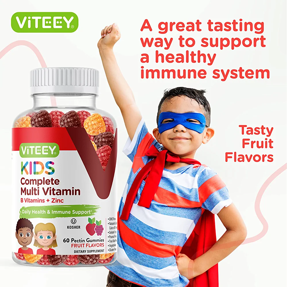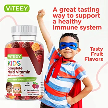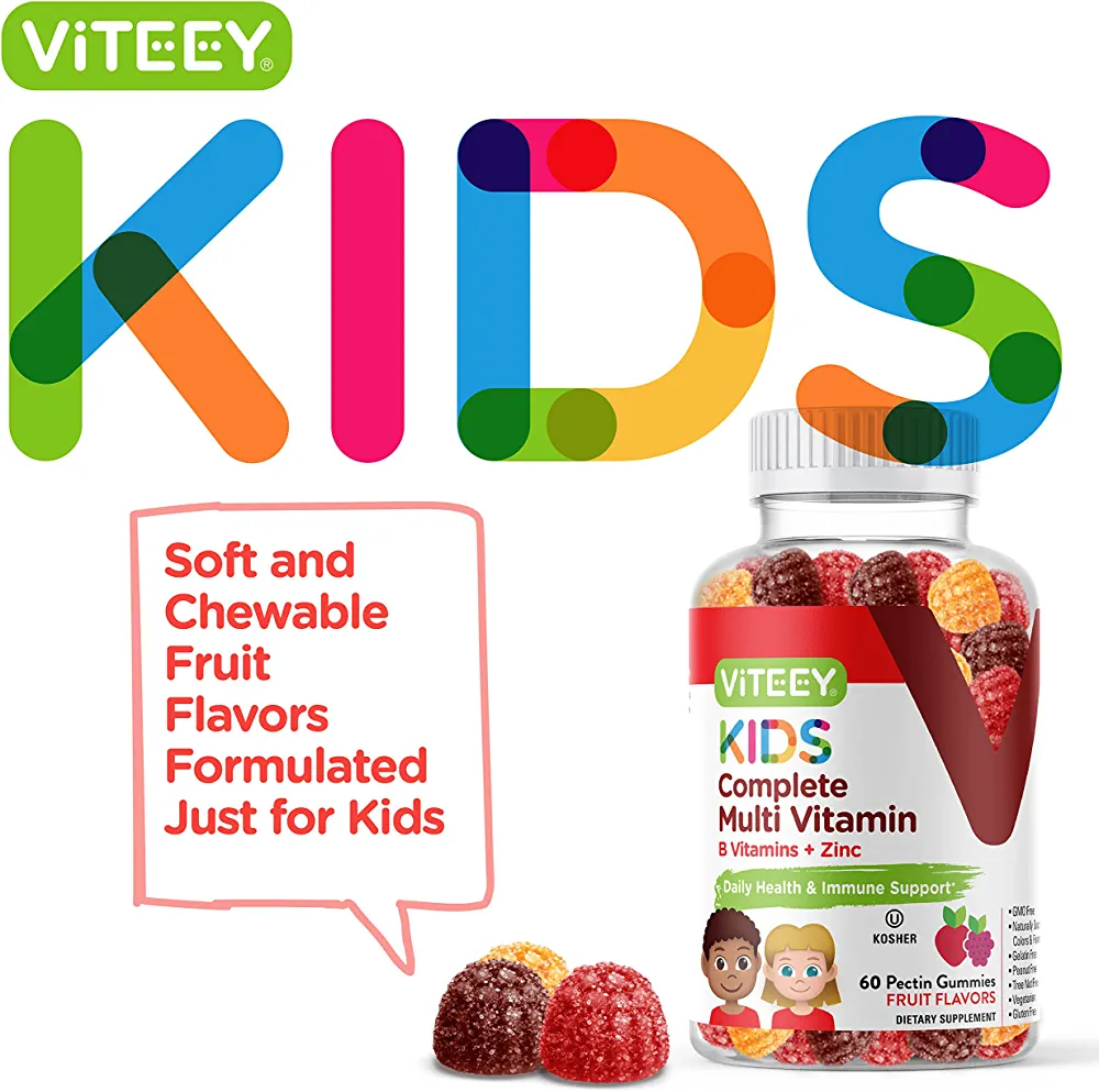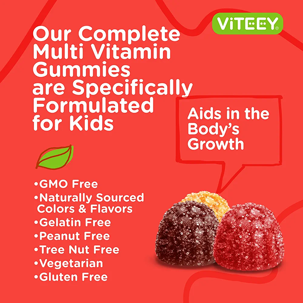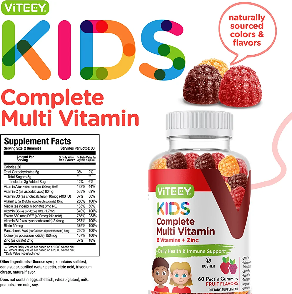 This product contains 60 gummies, which is a one-month supply. It is made with naturally sourced vitamins and minerals, including Vitamin A, Vitamin C, Vitamin D3, Vitamin E, Niacin, Vitamin B6, Folate, Vitamin B12, Biotin, Calcium, Iodine, and Zinc. The serving size is 2 gummies, and it is recommended to take 2 to 4 gummies daily for best results. This product is Kosher certified and produced to a higher standard. The gummies come in great fruit flavors, making it easy and enjoyable to consume your daily dose of nutrition. This specially formulated 12 in 1 multi-vitamin gummy provides immune support and overall health benefits. The ingredients are sourced from all-natural sources, and the gummies are vegan, gelatin-free, peanut-free, tree nut-free, GMO-free, and gluten-free. The Viteey brand adheres to high-quality standards, and all products undergo extensive lab testing to ensure purity and potency.