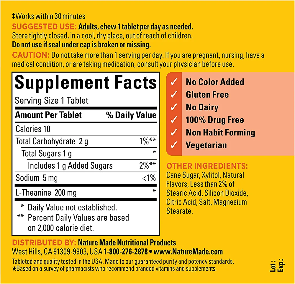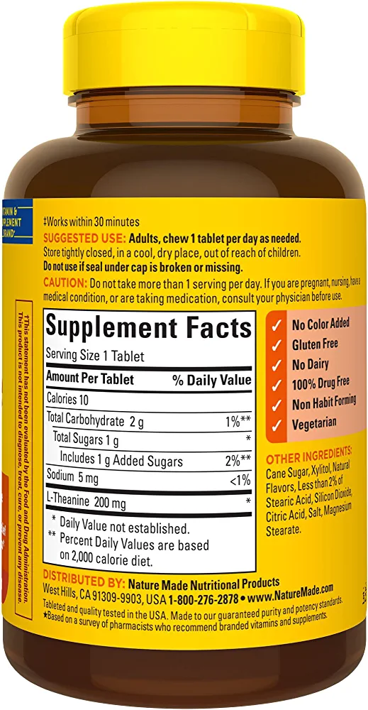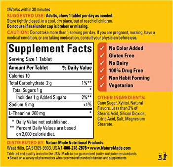| descriptionOriginal | Description Nature Made L-Theanine 200mg chewable tablets help relax the mind without causing drowsiness for fast-acting stress relief (1). L-Theanine is an amino acid that quickly helps you manage stress in the moment. These L Theanine chewables come in a delicious tropical fruit artificial and natural flavor and have no color added, no dairy, and are gluten free, 100% drug free, and suitable for vegetarians. Adults, chew one L Theanine tablet per day as needed. Start your day with Nature Made L-Theanine supplements. (1)Works within 30 minutes. *Based on a 2022 survey of pharmacists who recommend branded vitamins and supplements. These statements have not been evaluated by the Food and Drug Administration. This product is not intended to diagnose, treat, cure, or prevent any disease. |