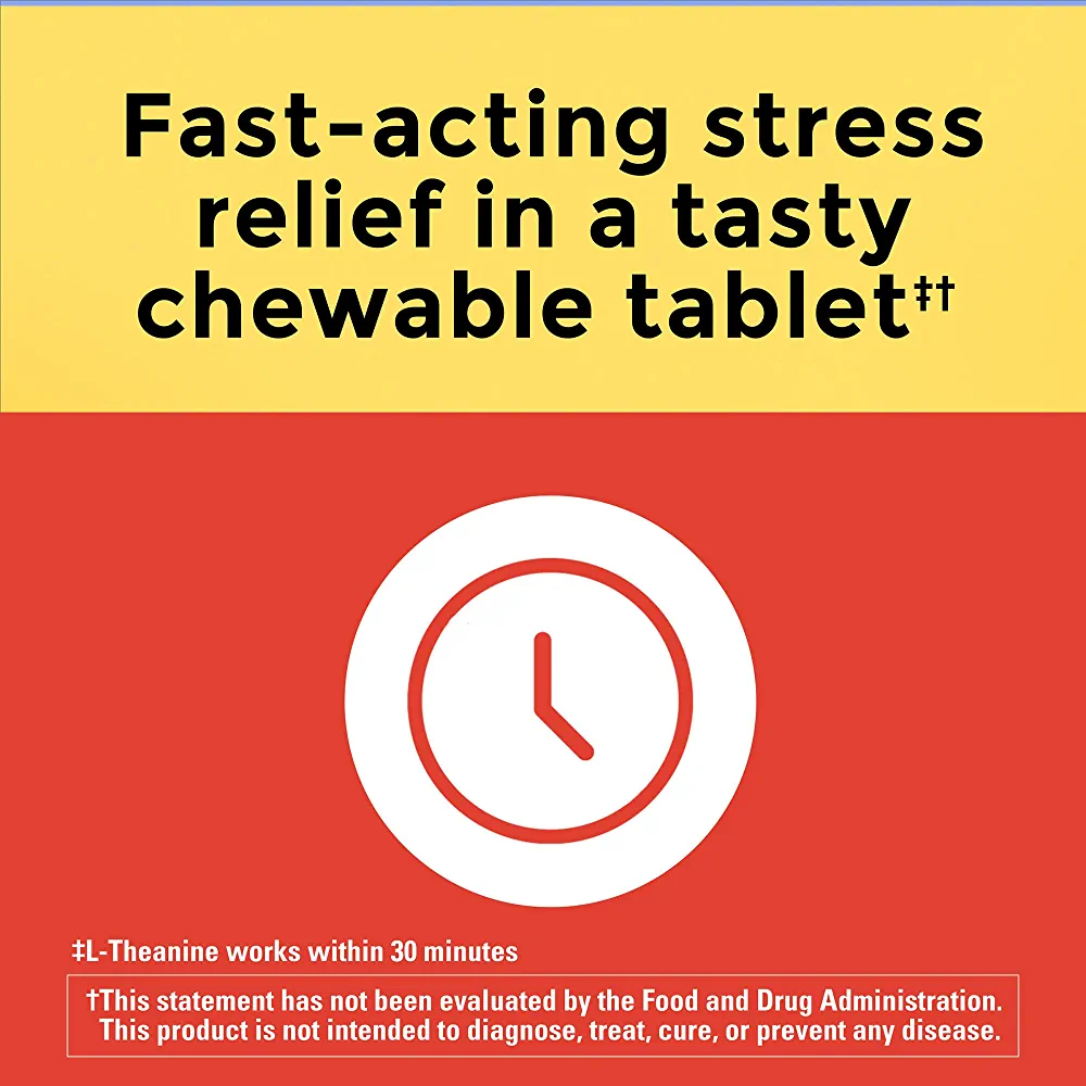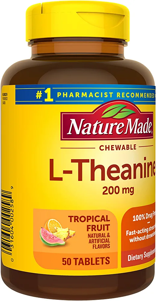Nature Made L-Theanine 200mg chewable tablets are designed to provide fast-acting stress relief without causing drowsiness. These tablets contain L-Theanine, an amino acid that helps to relax the mind and manage stress in the moment. The tropical fruit flavor of these chewables is both artificial and natural, and they contain no added colors, dairy, or gluten. They are also 100% drug-free and suitable for vegetarians. Adults can take one L-Theanine tablet per day as needed. According to a 2022 survey of pharmacists who recommend branded vitamins and supplements, this product works within 30 minutes. Please note that these statements have not been evaluated by the Food and Drug Administration, and this product is not intended to diagnose, treat, cure, or prevent any disease. Start your day with Nature Made L-Theanine supplements for a stress-free day.
