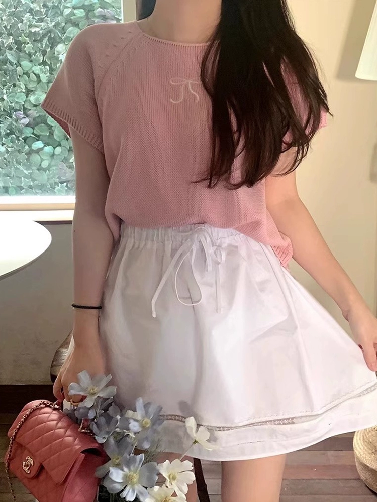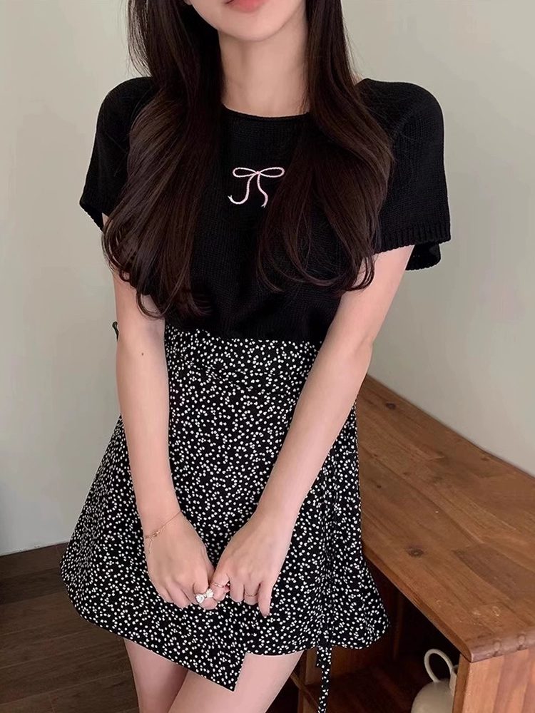 chic gentle temperament round neck knitted bow print
