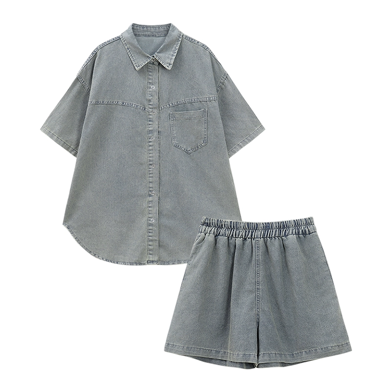 chic Hong Kong style retro denim casual wide leg short sleeves