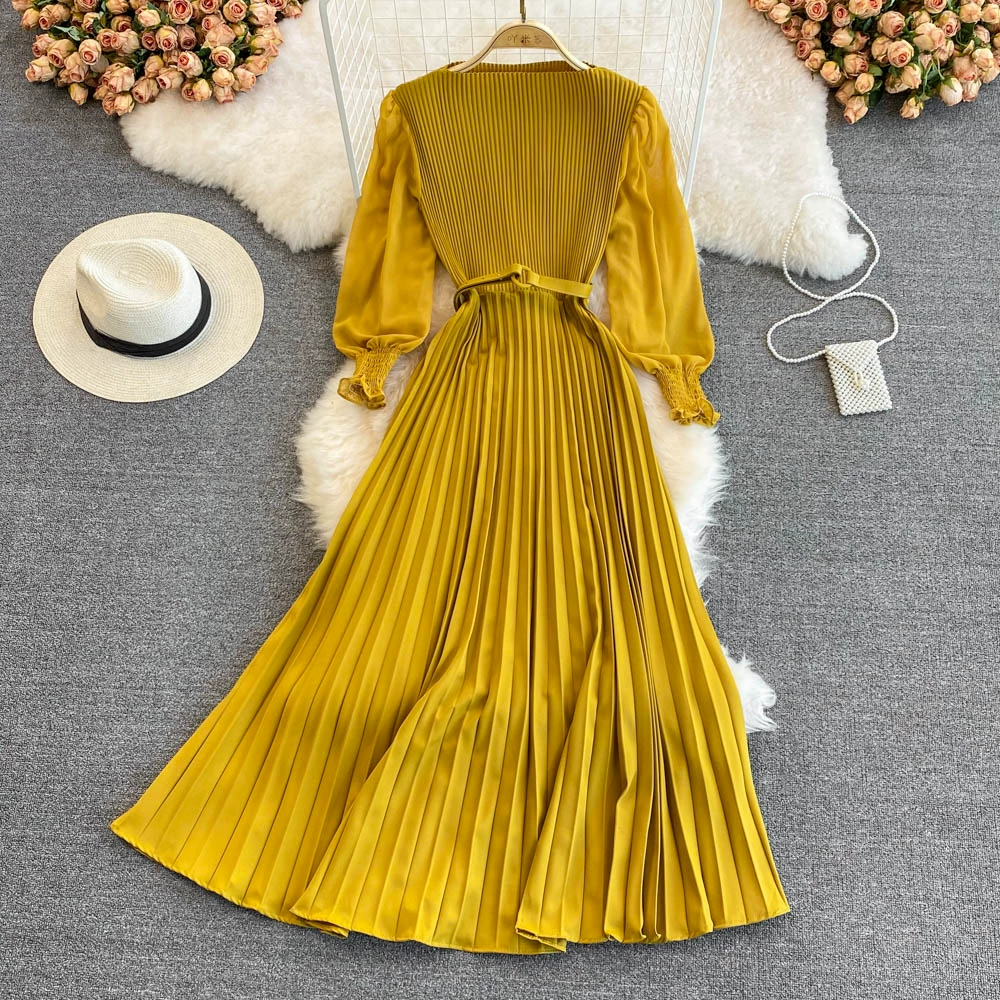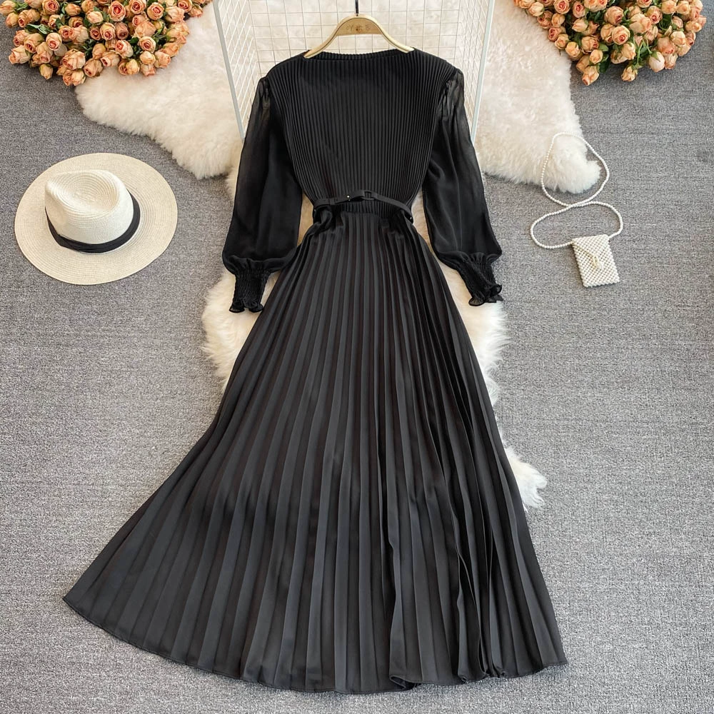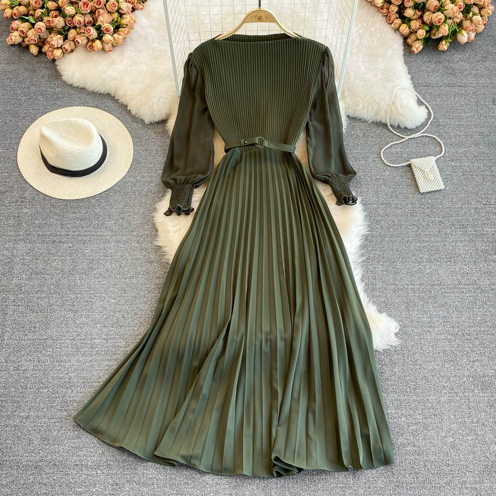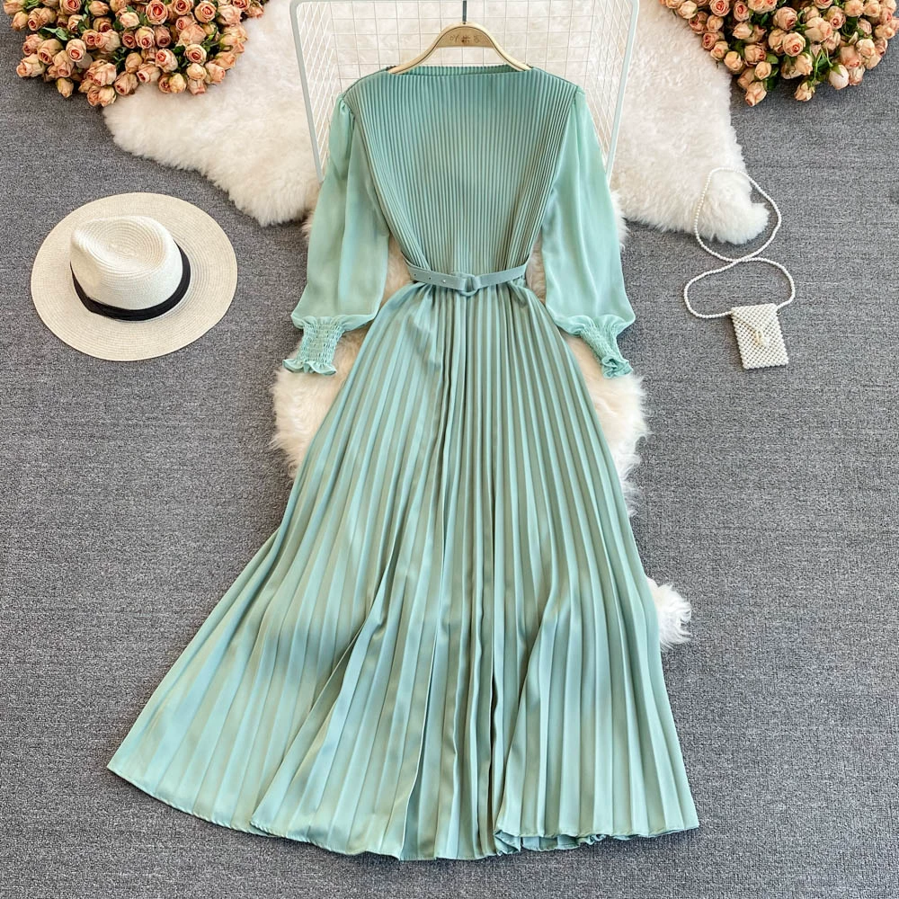 | nameOriginal | chic korean new style round neck pleated dress with wide hem |