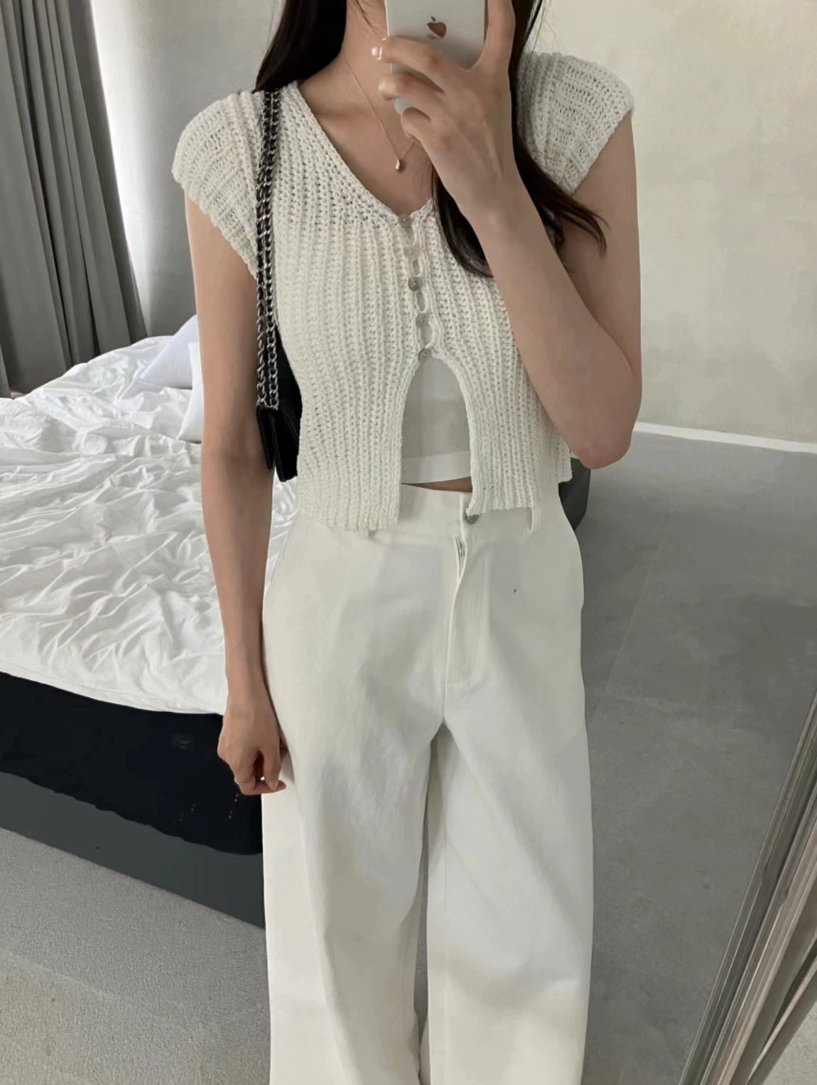 chic niche V-neck buttoned slit short-sleeved sweater