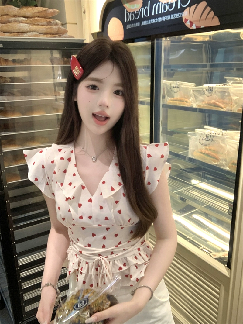 | nameOriginal | Chic peach heart lace-up Korean style slimming small flying sleeve shirt |