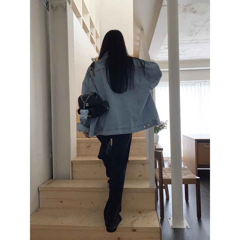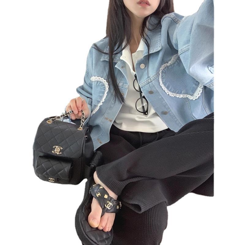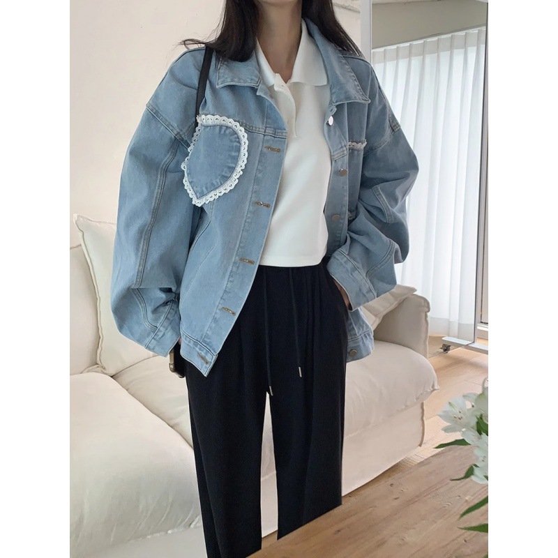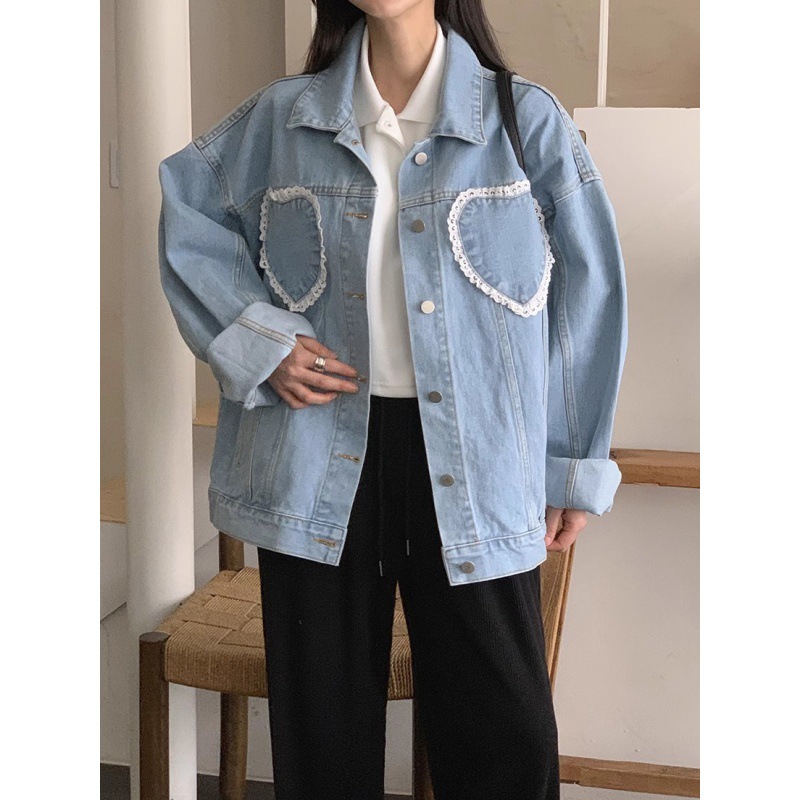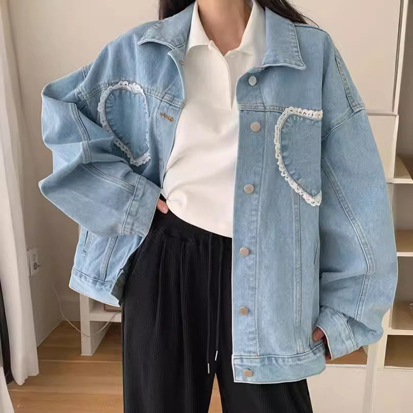 chic Retro lapel lovely lace stitching decoration loose plus size single-breasted Denim jacket short coat for women