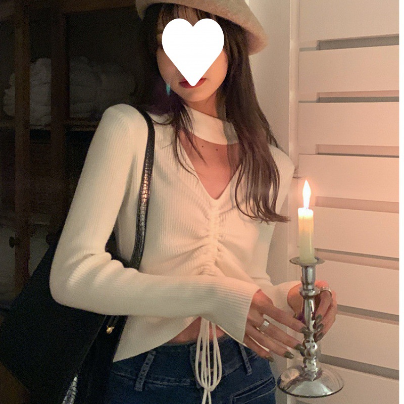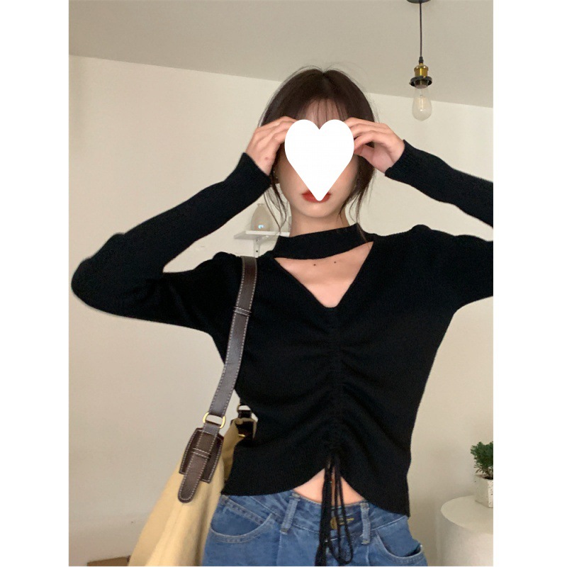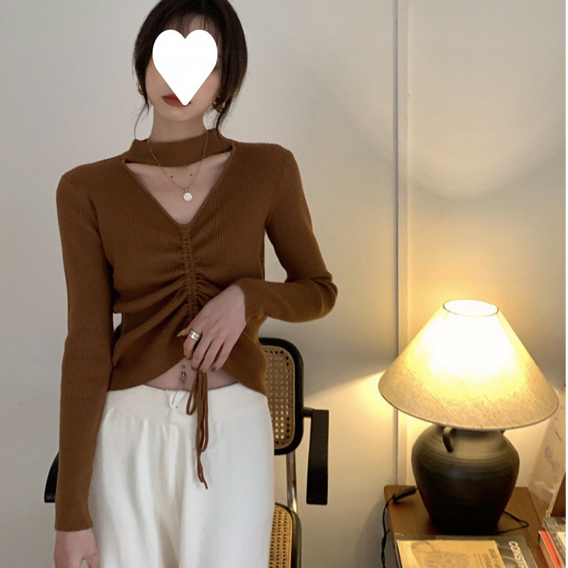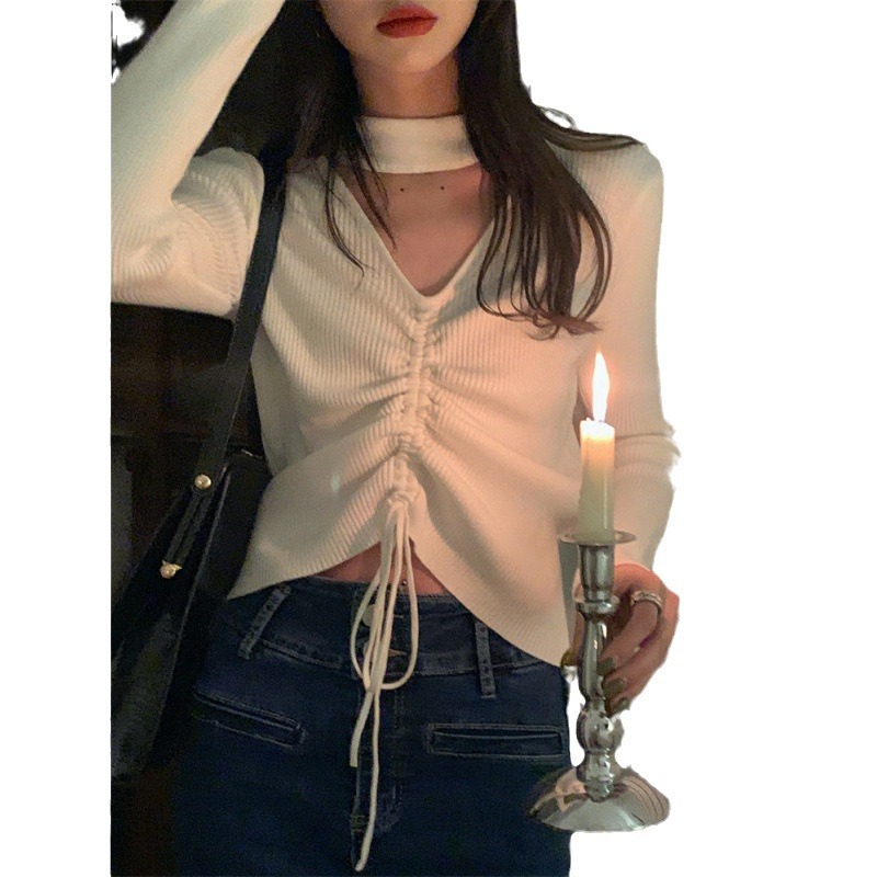 Chic sexy halter long sleeve T-shirt women’s autumn French style super nice collar drawstring knitted