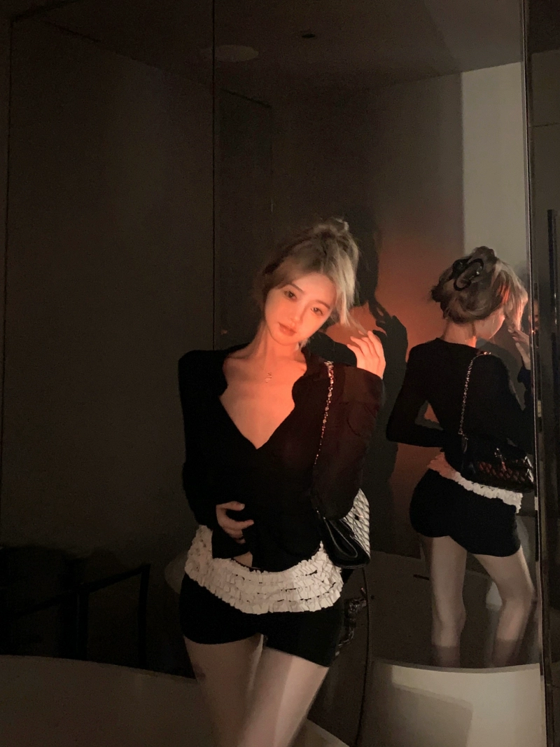 Chic V -neck tight body arc black long -sleeved T -shirt