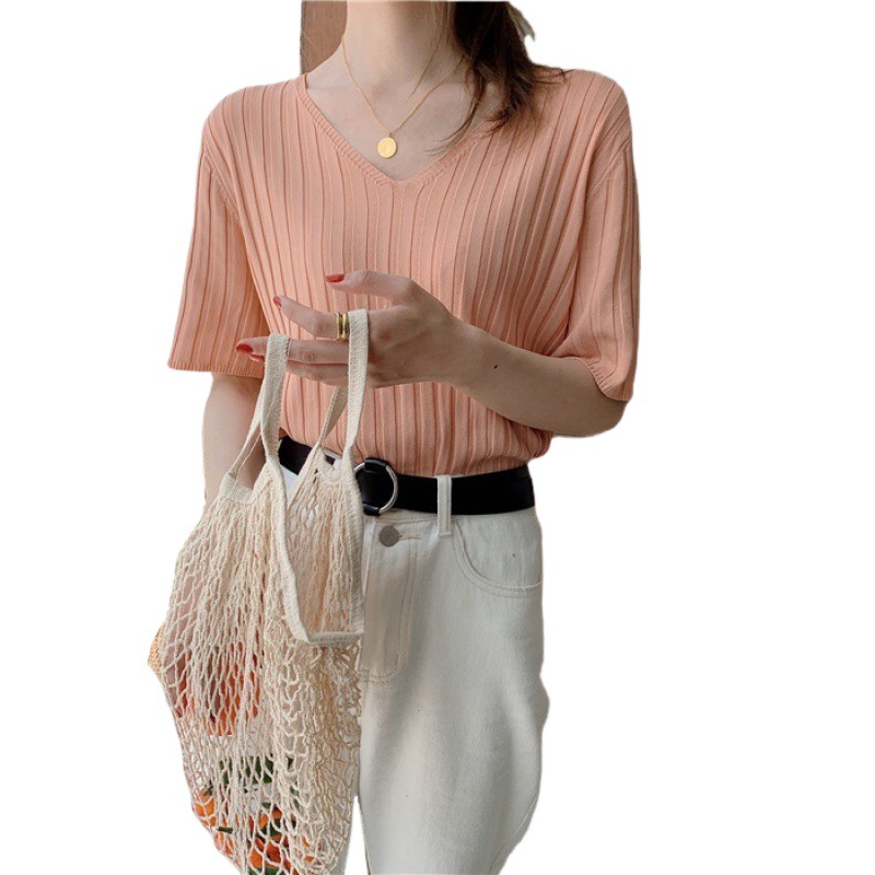 | nameOriginal | Chicken Heart Collar Base Shirt Women's Summer Loose Candy Color Matcha Green Top Thin Ice Silk Short-sleeved Knitted T-shirt |