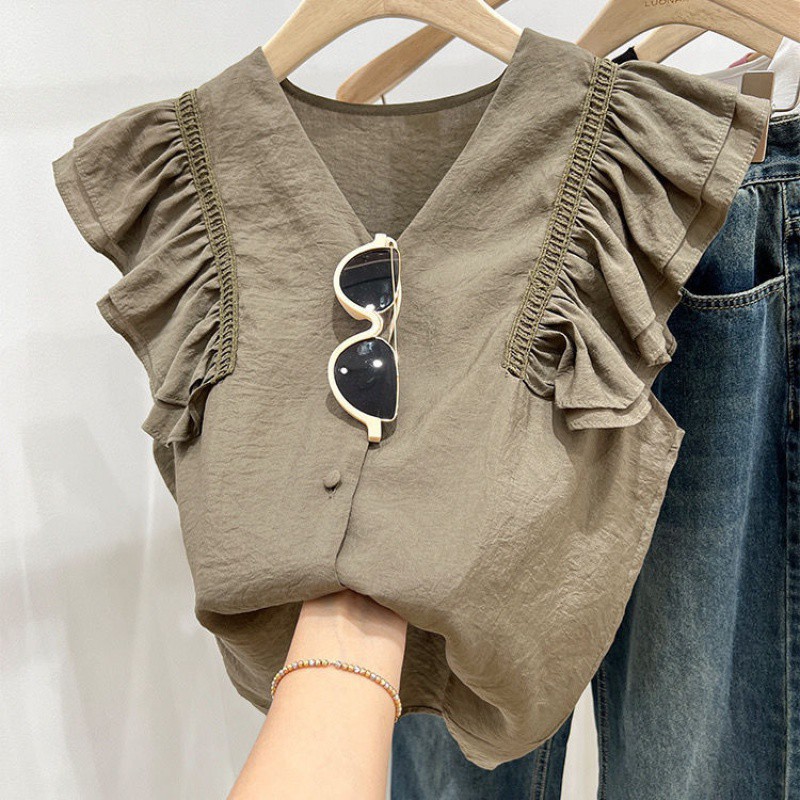 | nameOriginal | Chiffon Lace Shirt Women's Petite Flying Sleeve French Ruffled V-neck Clavicle Design Sense Sleeveless Top for Women |
