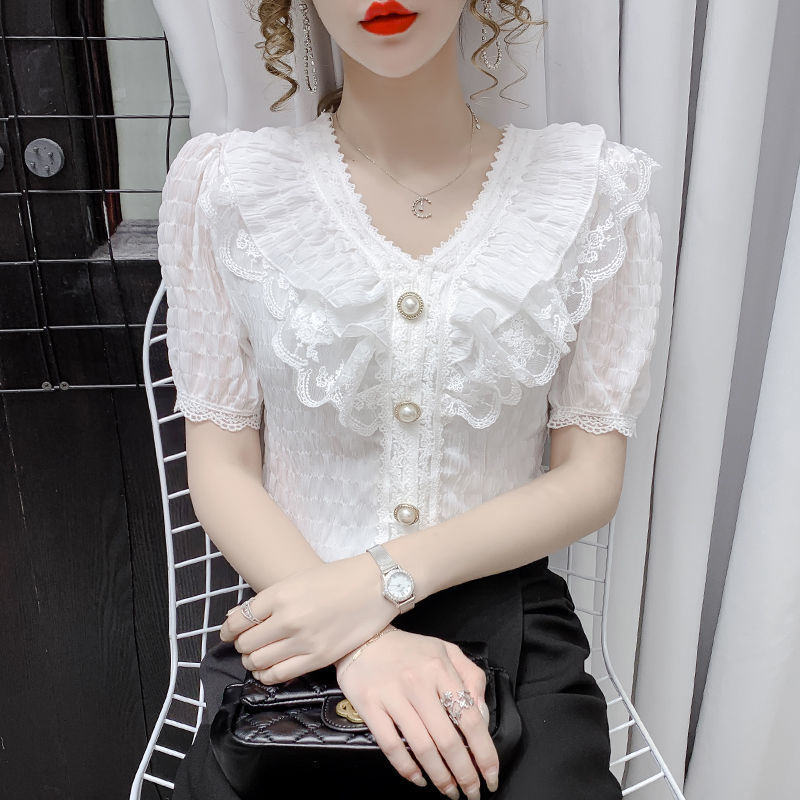 | nameOriginal | Chiffon Shirt Women's Summer 2022 New Elegant Stylisch V-neck Shirt Ruffled Lace Top Women's Short-sleeved Shirt |