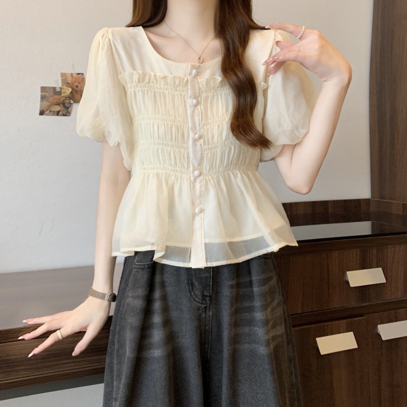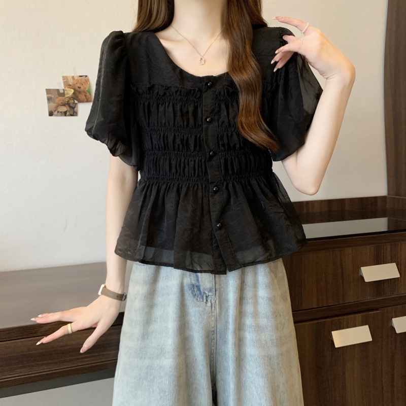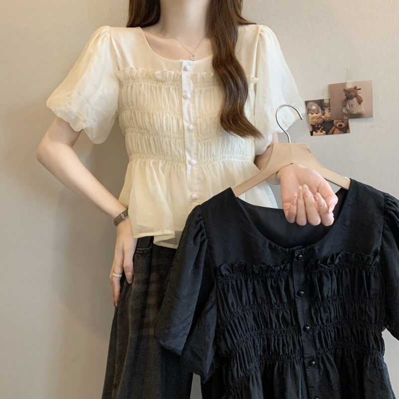 | nameOriginal | Chiffon Shirt Women's Summer 2024 New plus size Giant Slim chubby girl Design Pleated Puff Sleeve Age-reducing Top |