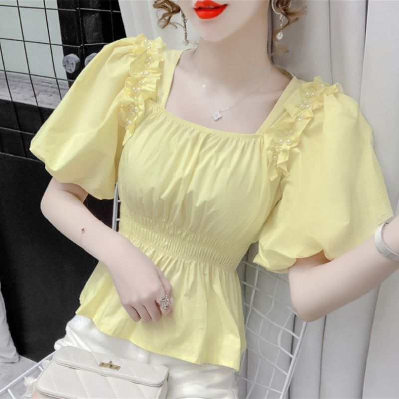 | nameOriginal | Chiffon Shirt Women's Summer 2024 New Style Square Collar Beaded Ruffled Short-sleeved Top Chic French Small Shirt |