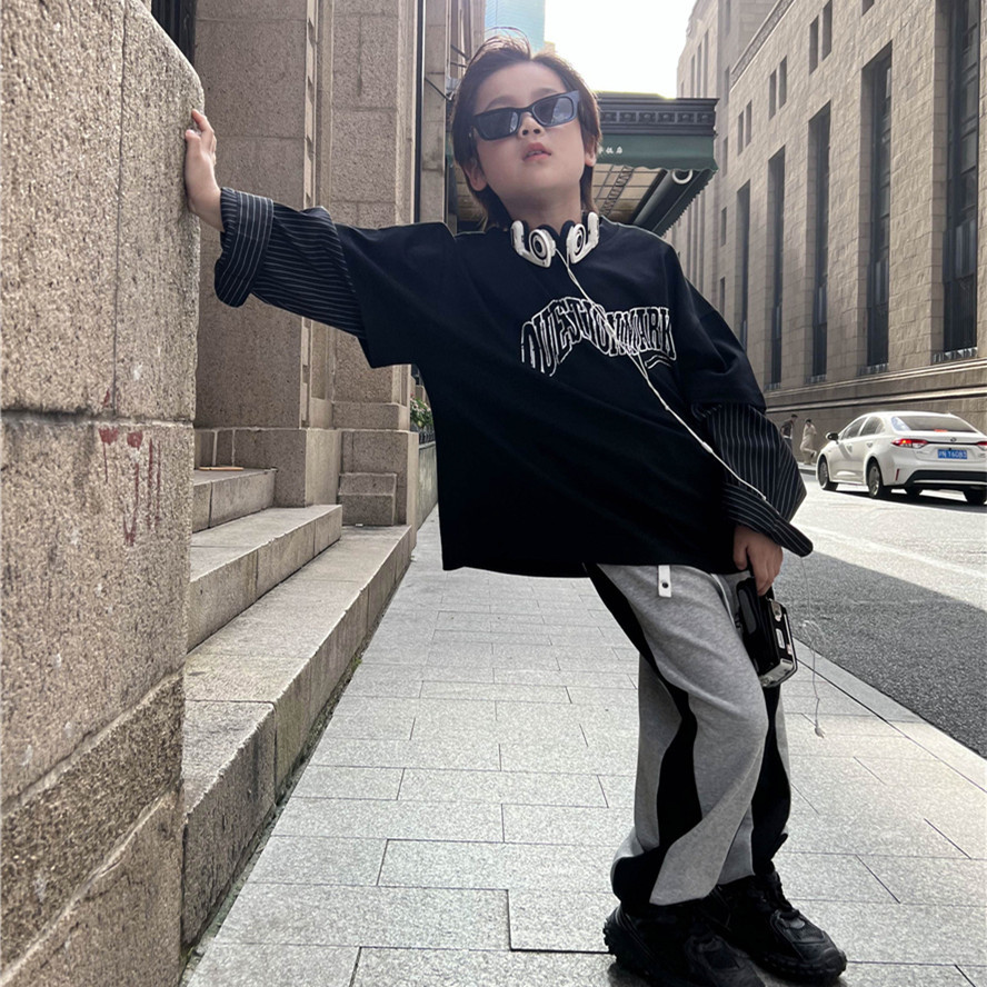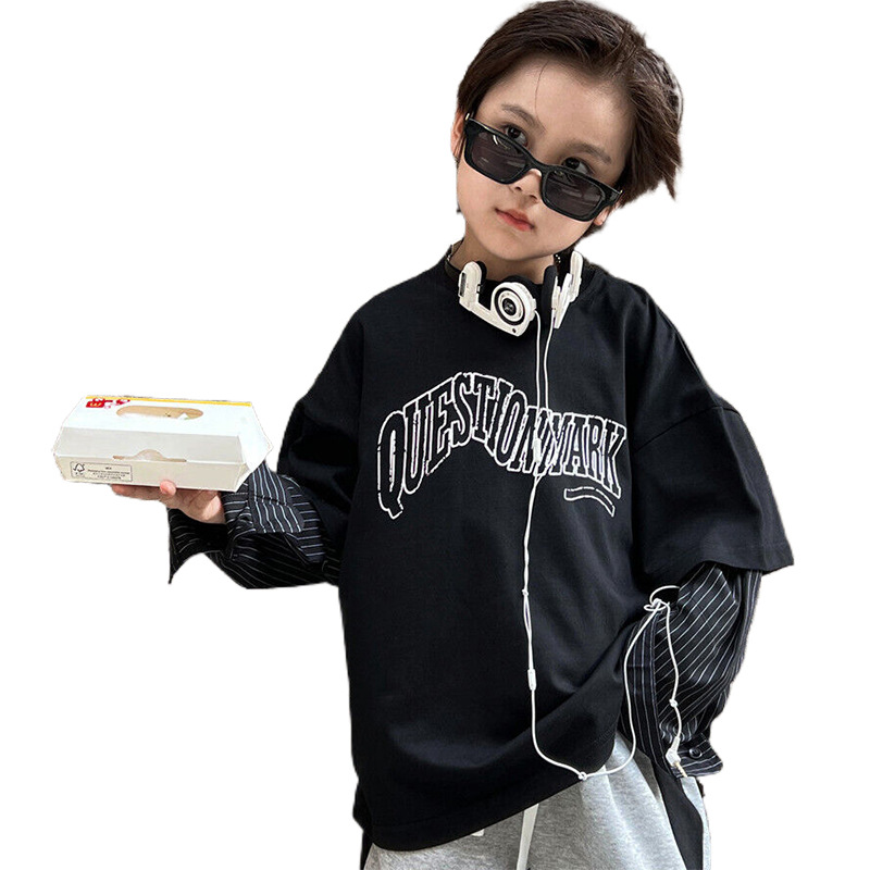 | nameOriginal | Children's 2024 spring new children's fake two-piece T-shirt niche 300g striped shirt sleeve boys' bottoming shirt |