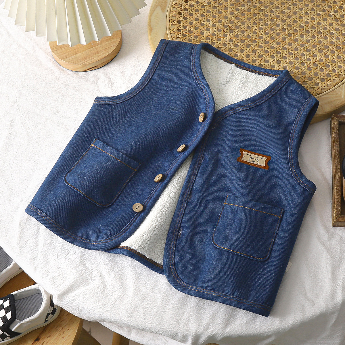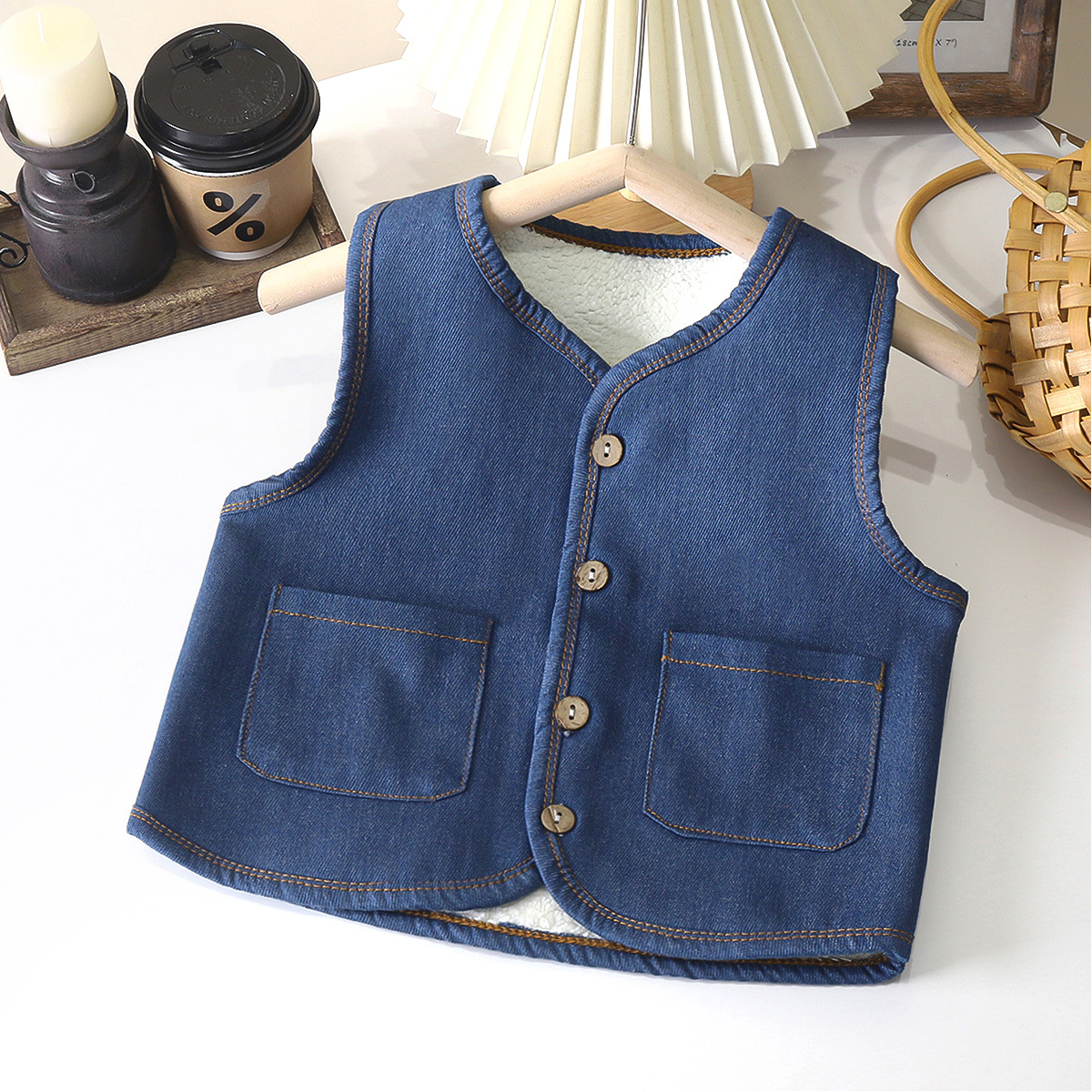 Children’s autumn and winter fleece-lined real Denim vest outer wear fashion trendy loose boys and girls baby thickened coat