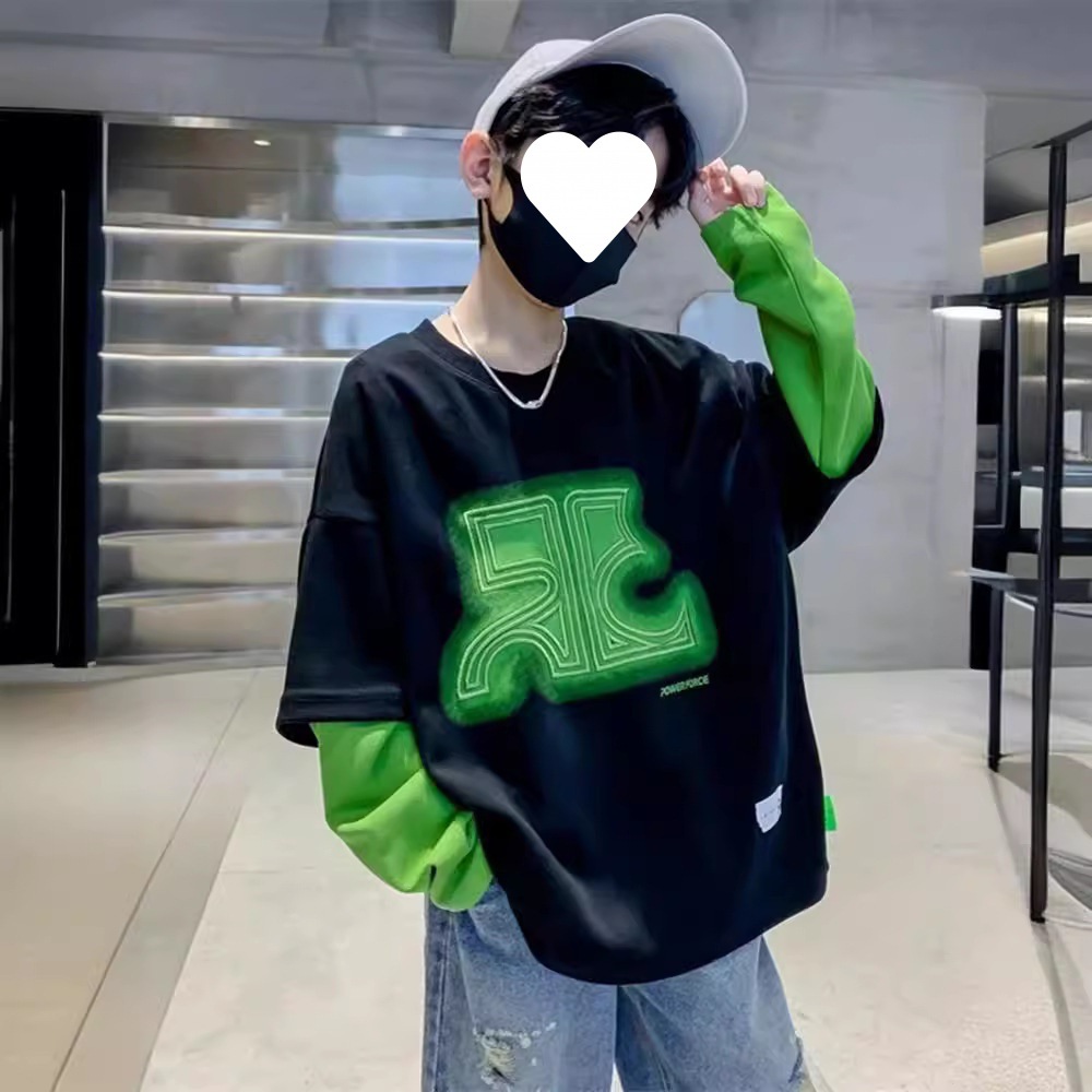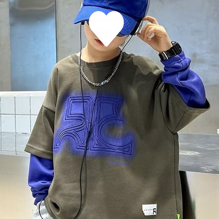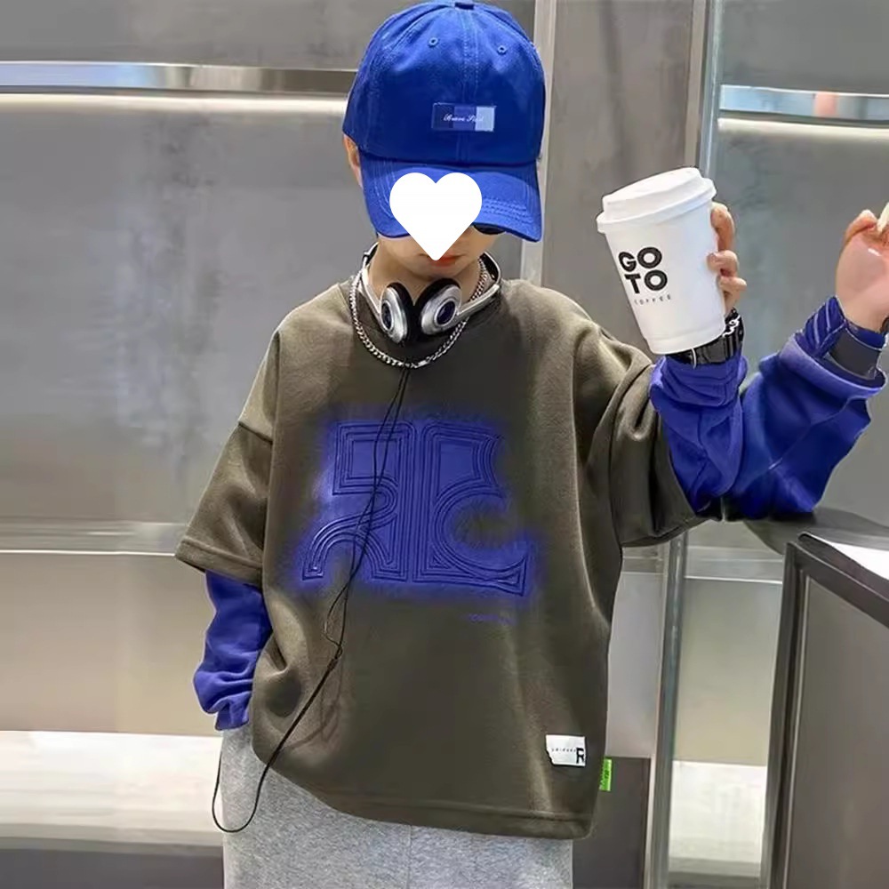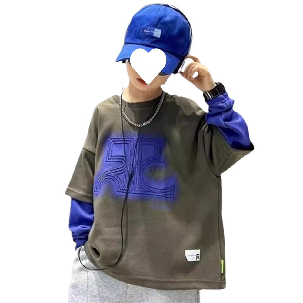 Children's Fake Two-piece T-shirt Sweatshirt Long-sleeved Western Style Top Big Boy's Spring and Autumn 2024 New Fashionable Brand Fried Street