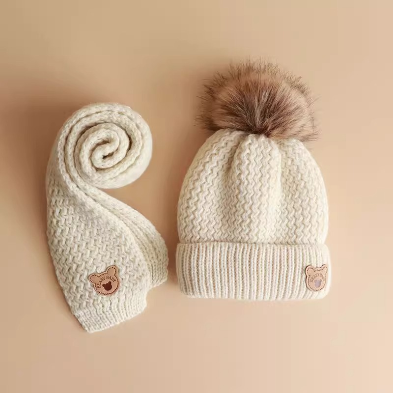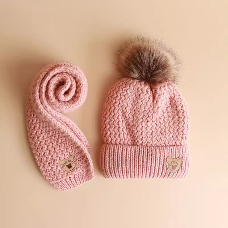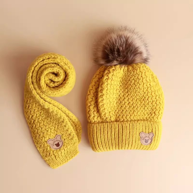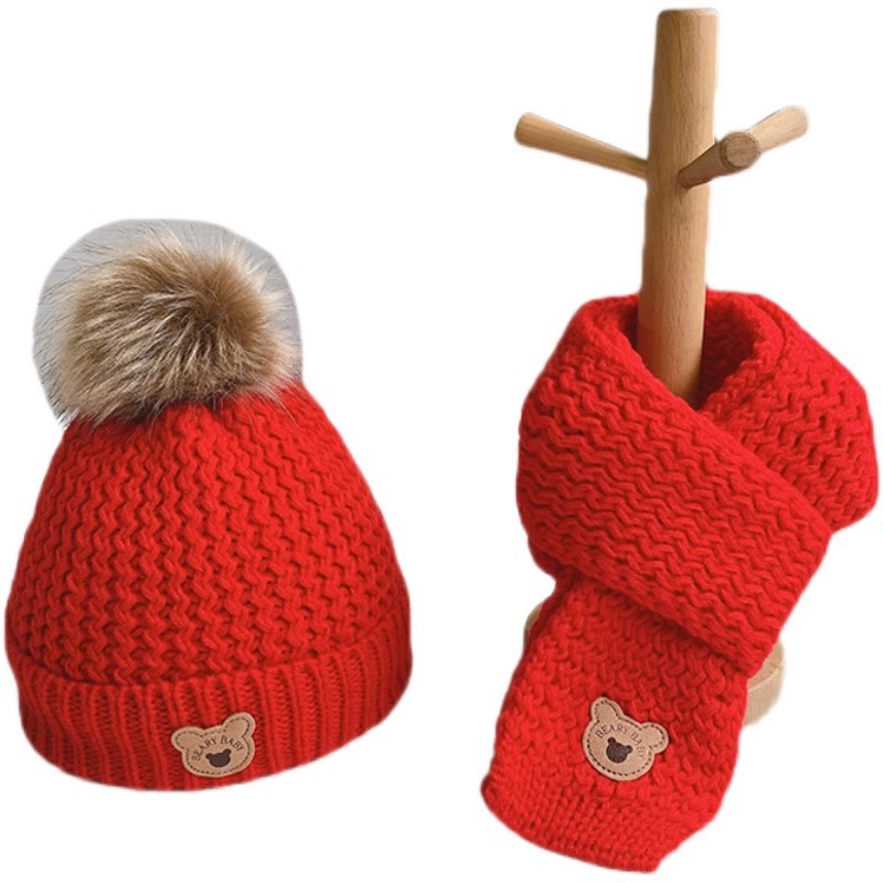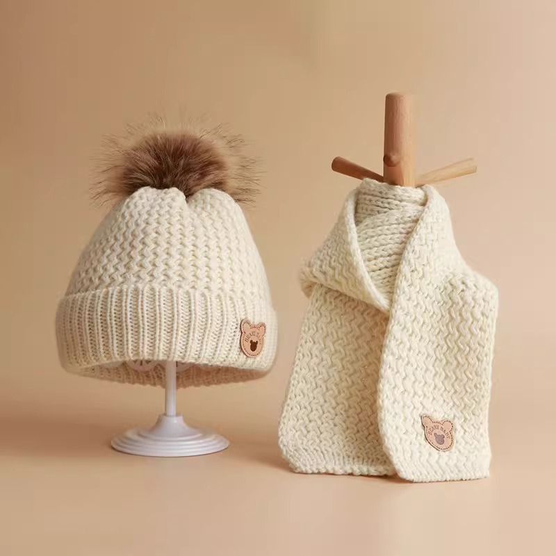 | nameOriginal | Children's hat autumn and winter scarf suit boys and girls fleece-lined bear leather label knitted wool hat warm earmuffs |