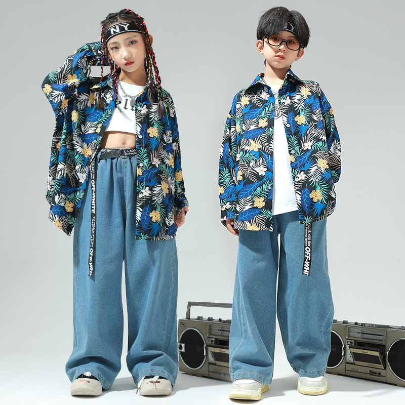 | nameOriginal | Children's hip hop fashion clothes boys and girls hip hop jeans suit children's retro Hong Kong style floral shirt catwalk show costume |