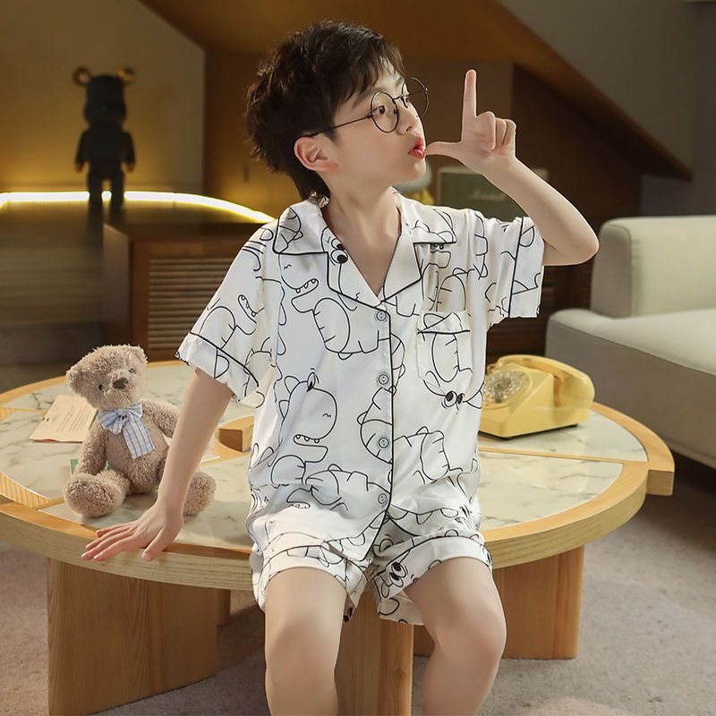 Children’s Ice Silk Pajamas Boys Thin Summer Short-sleeved Boys Silk Summer Baby Air Conditioning Home Clothes suit Summer