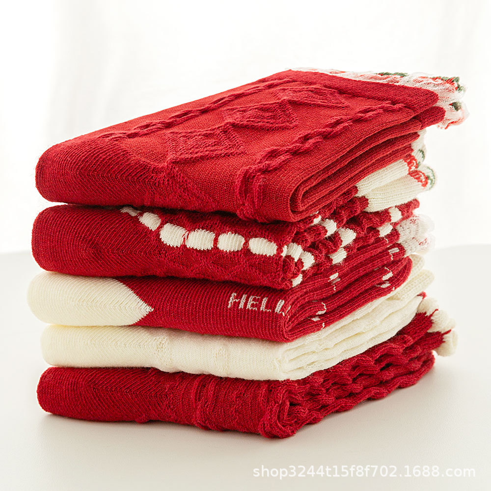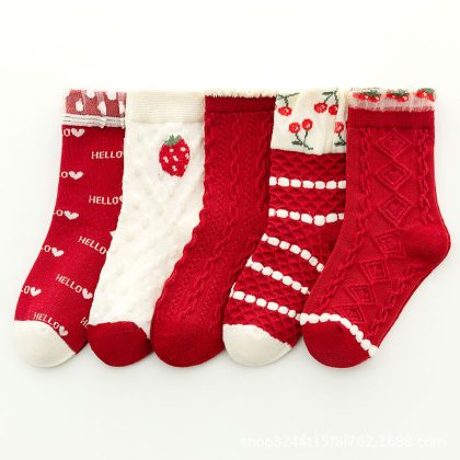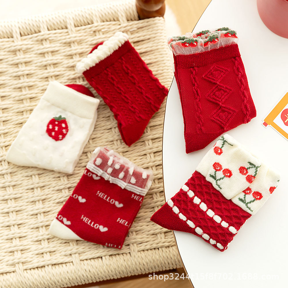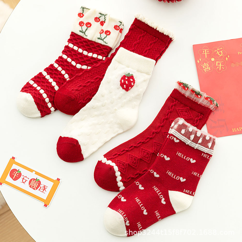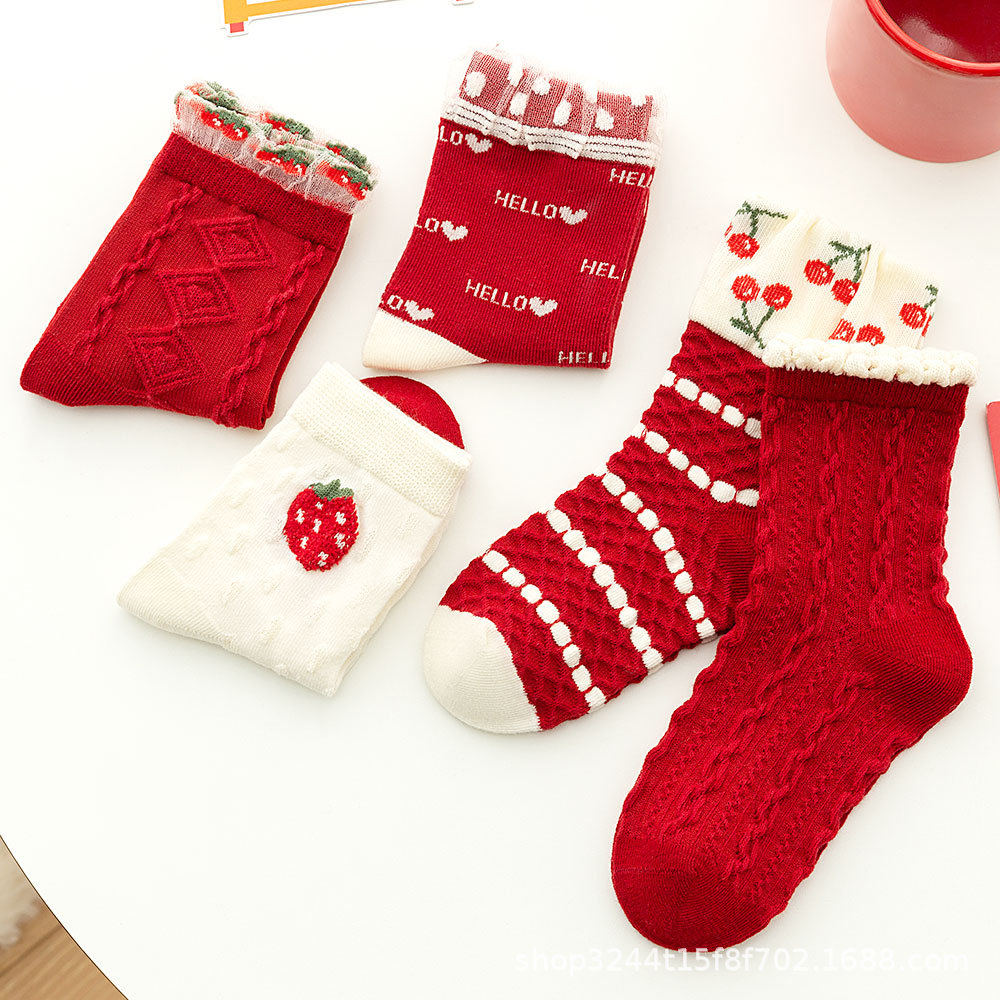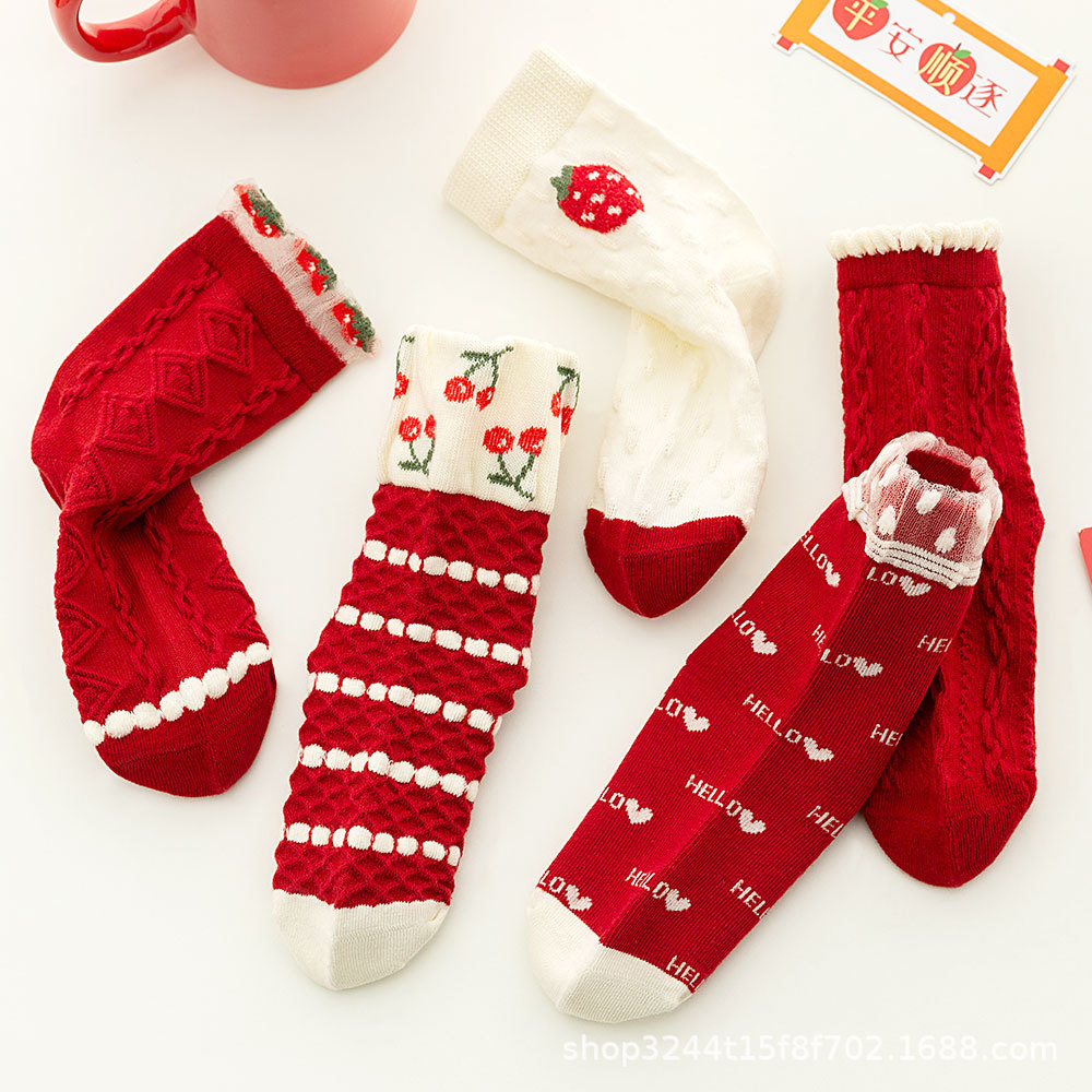 Children's Knitted Socks Red Native Year Children's Socks Small Cherry Medium Cylinder Printed Girls Spring and Summer Baby Cotton Socks