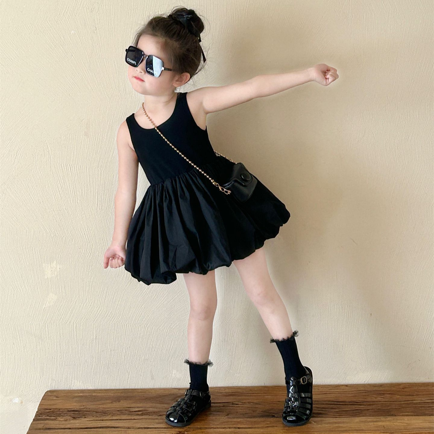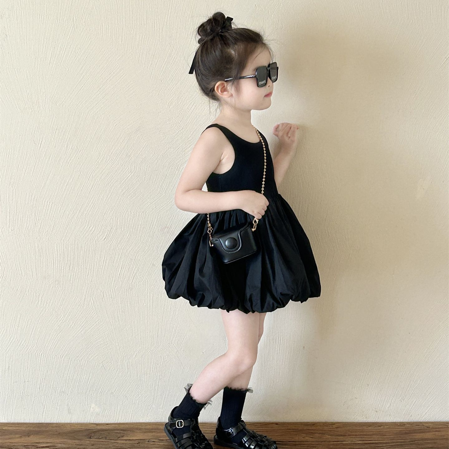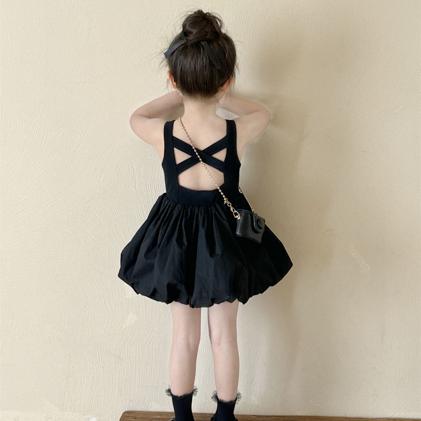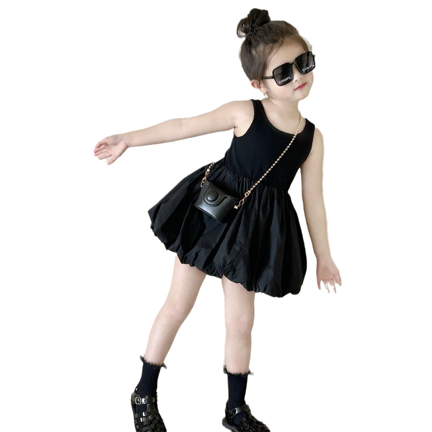 Children’s Korean-style Dress 2024 Summer New Children’s Wear Children’s Fashionable Black Sleeveless Princess Dress with Leaky Back