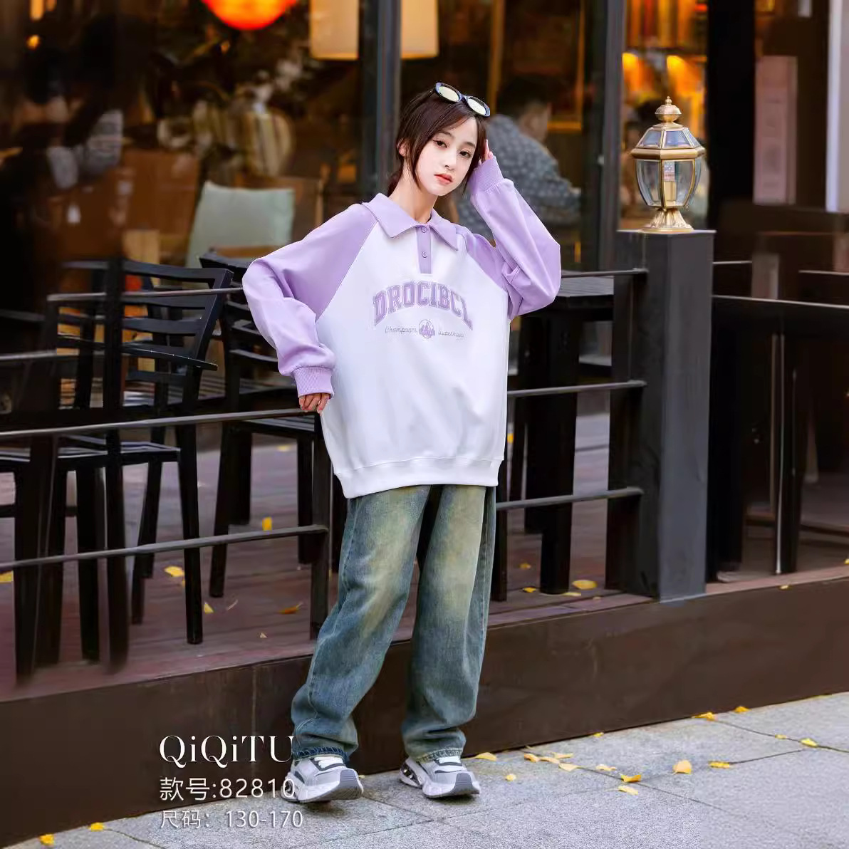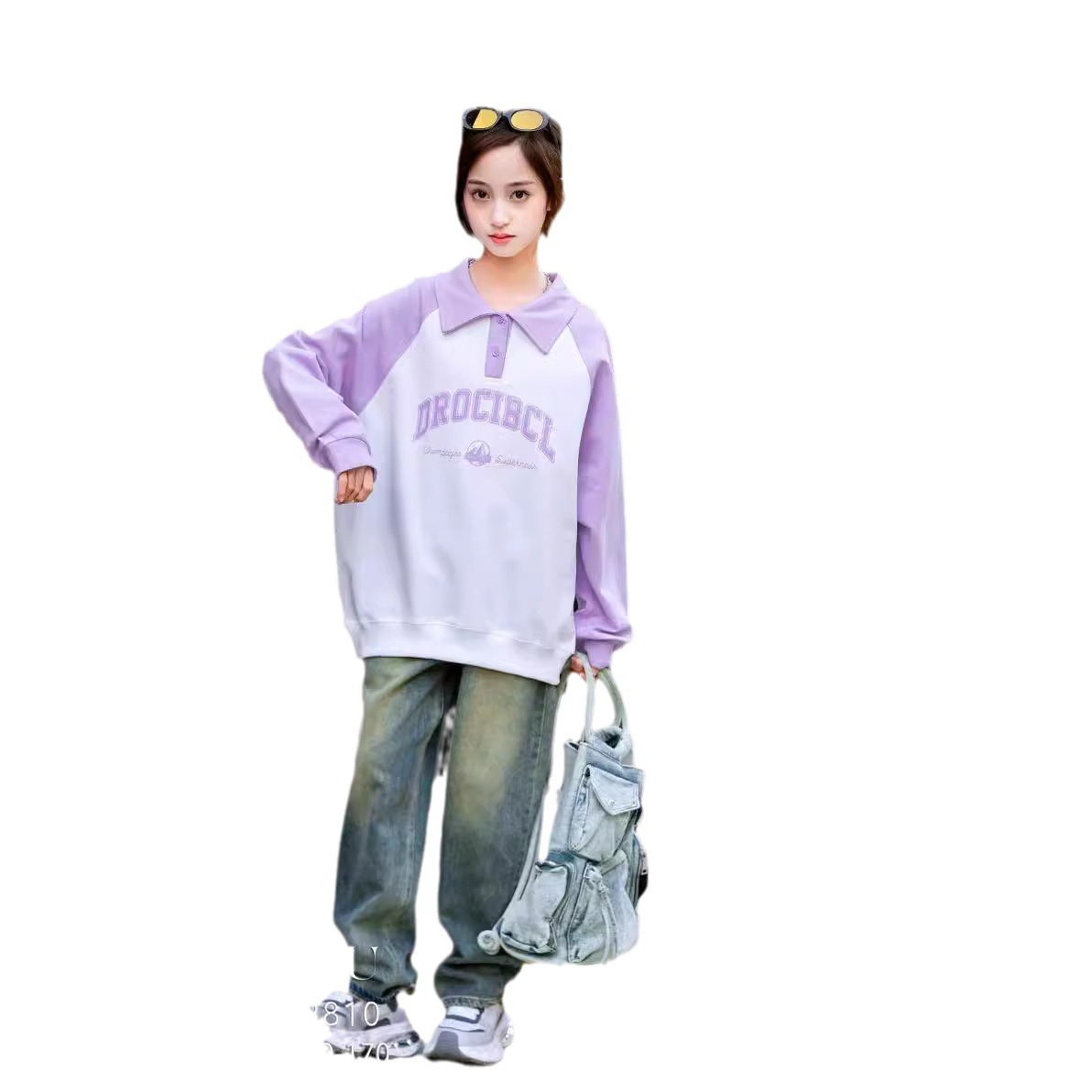 Children's long-sleeved polo shirt 2024 children's spring casual loose girls' color matching lapel sweater top wholesale