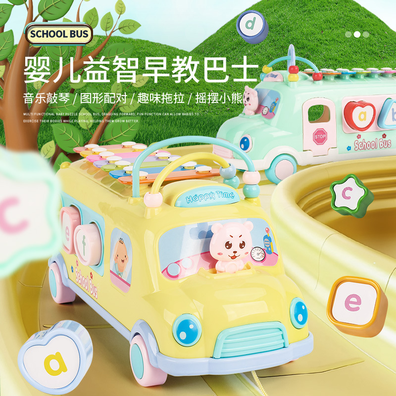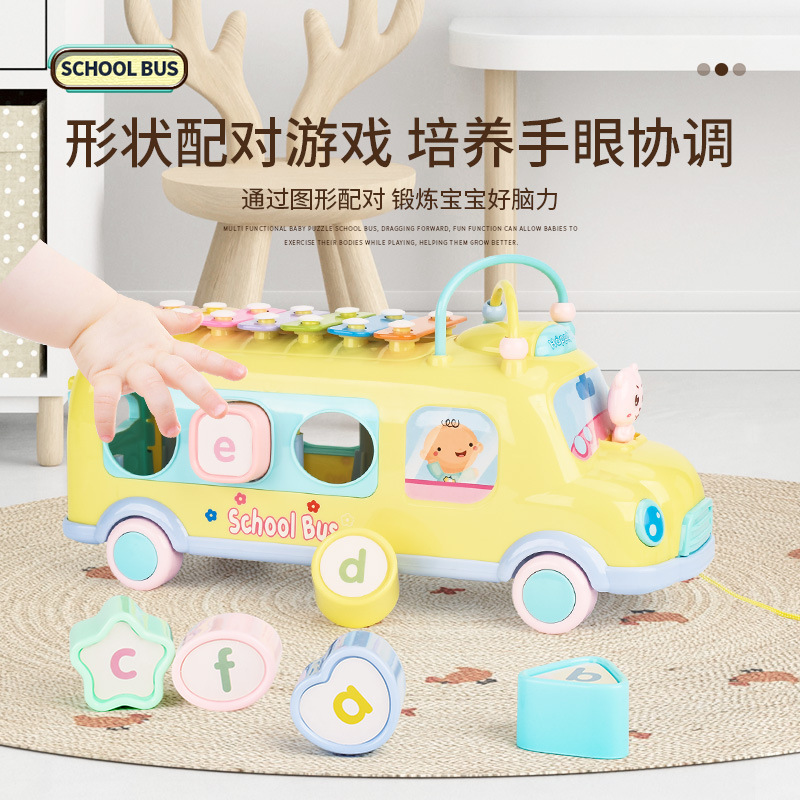Children's Multi-function Bus Eight-tone Knocking Piano Baby's Building Blocks Matching Winding Beads Pull Line Car Educational Early Education Toys