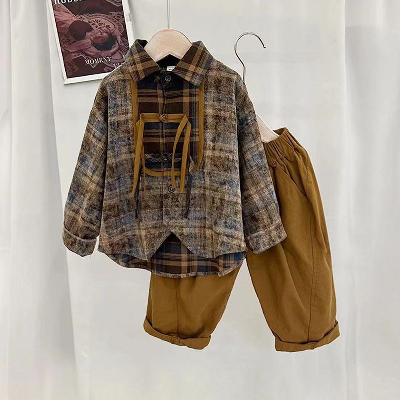 | nameOriginal | Children's New 2024 Autumn Antique Hanfu Boys Long Sleeve Plaid Laps Shirt suit Children's Two-Piece Set |