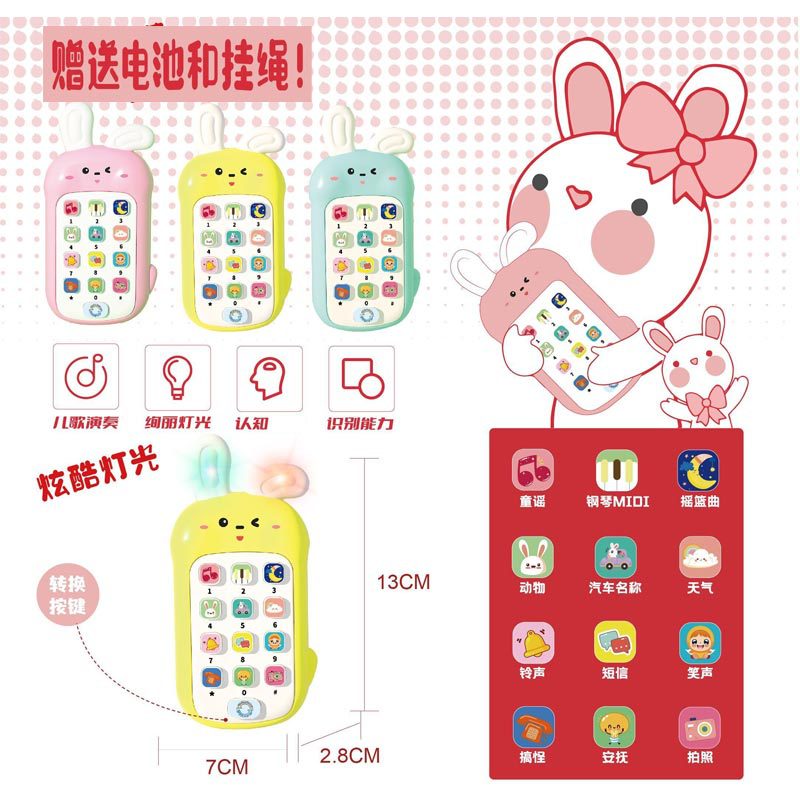 | nameOriginal | Children's play house light music cute rabbit small mobile phone toy 0526A parent-child interactive sound and light phone learning machine |
