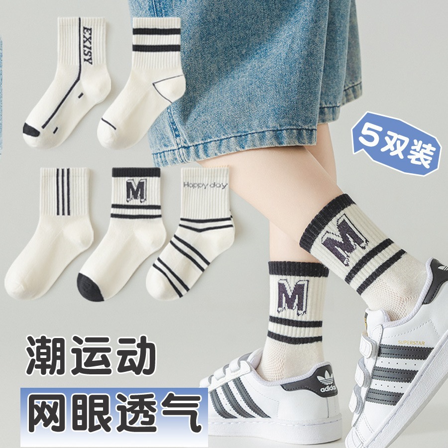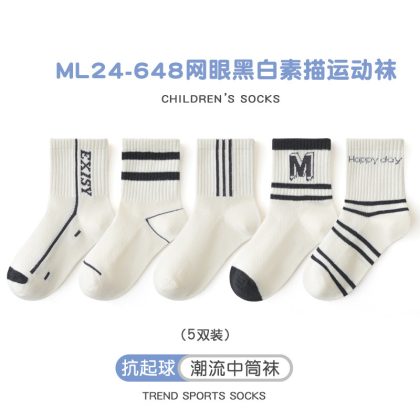 | nameOriginal | Children's socks spring and summer boys' and girls' socks black and white striped summer mid-calf socks mesh breathable letters student socks batch |