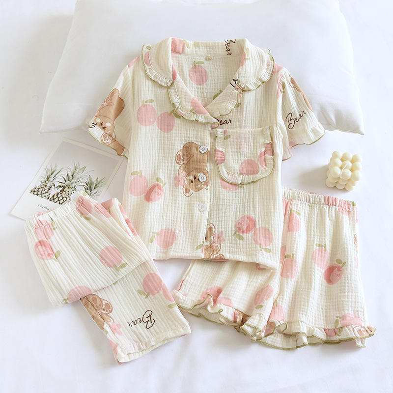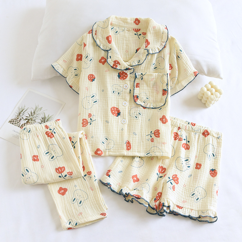 Children's Summer Thin Cotton Gauze Pajamas Set Three-Piece Small Fresh Parent-Child Short-Sleeved Trousers Shorts Home Clothes