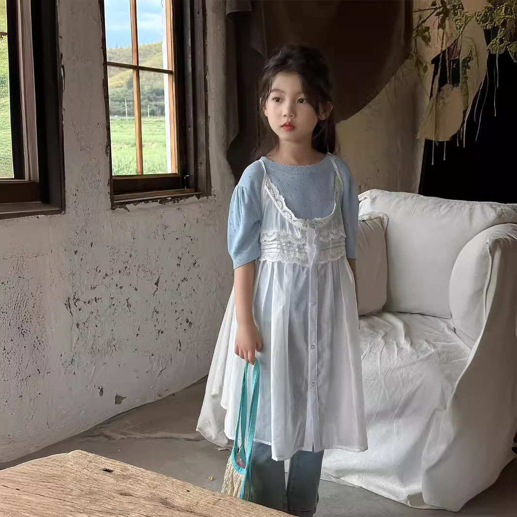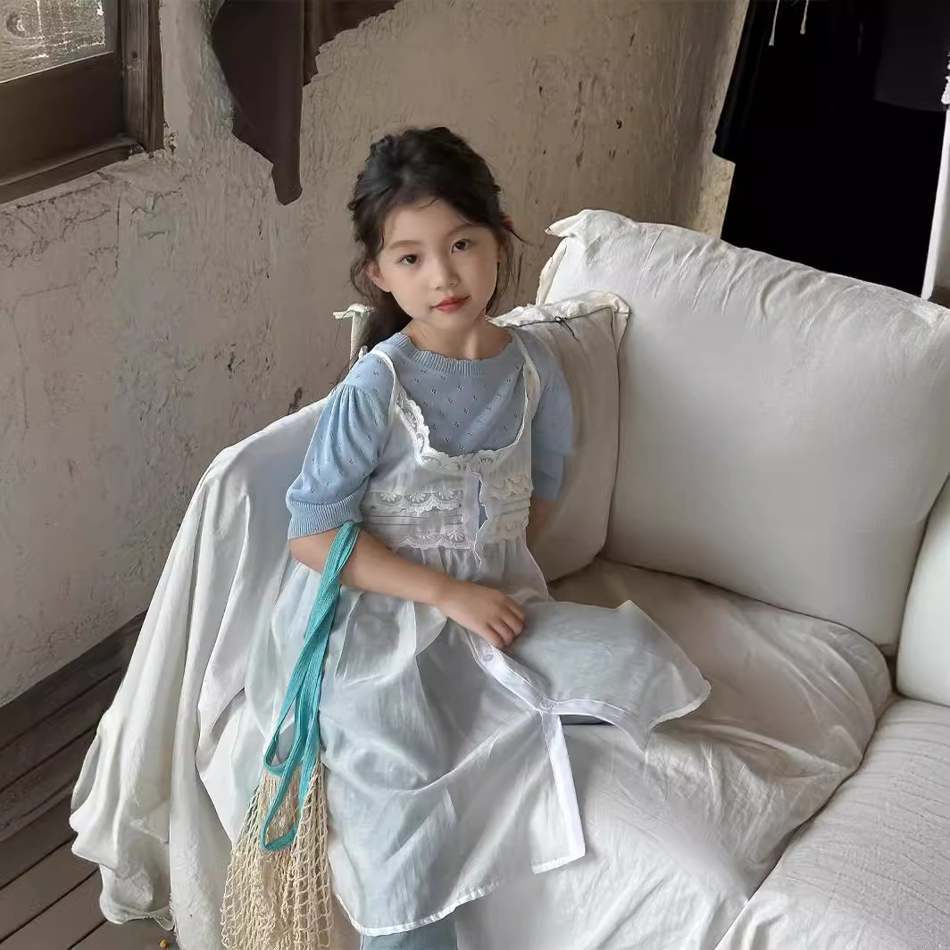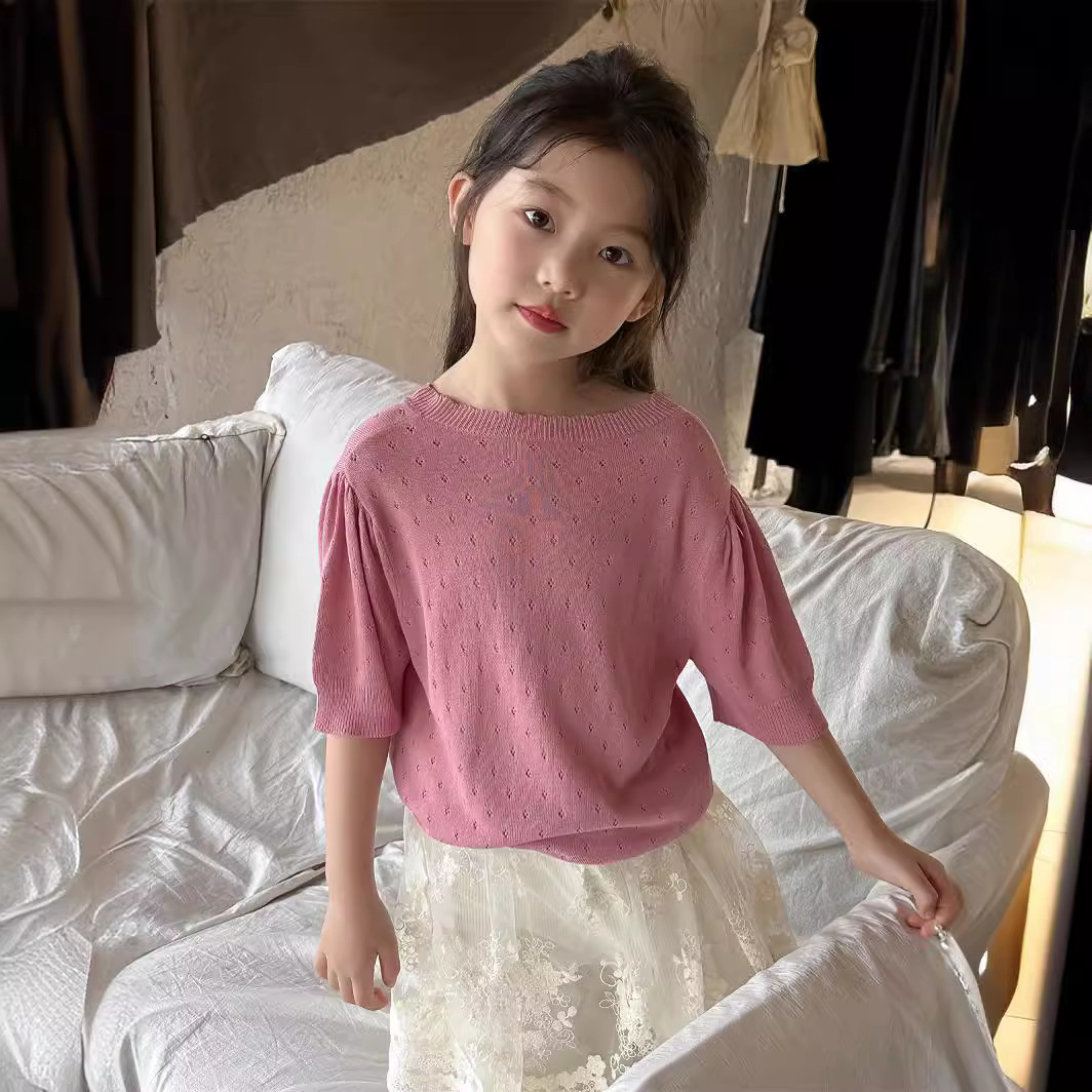 Children’s Sweater 2024 Summer New Girls’ Knitted Short-sleeved Top Children’s Solid Color Round Neck Top