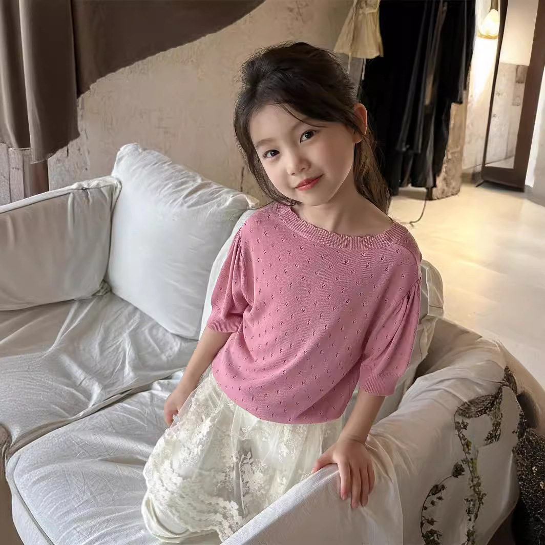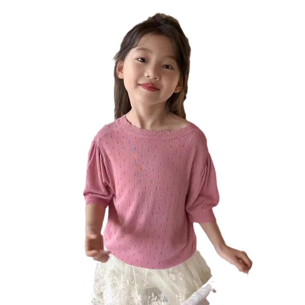 Children's Sweater 2024 Summer New Girls' Knitted Short-sleeved Top Children's Solid Color Round Neck Top