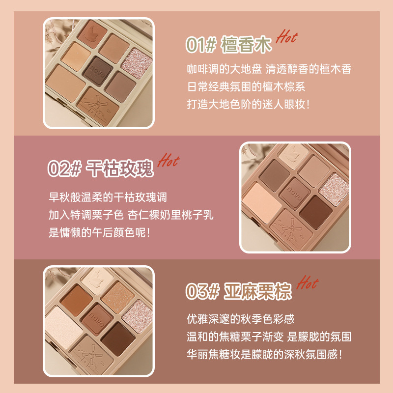 | nameOriginal | Chinese-made make-up NOVO eight-color eye shadow plate pearlescent fine shiny diamond natural matte high-gloss blush one-piece plate |