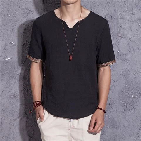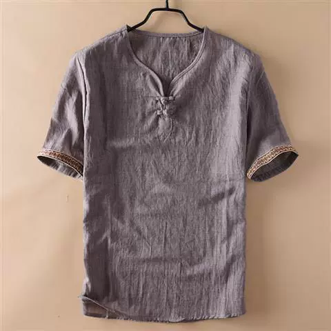 Chinese style disc button imitation linen short-sleeved T-shirt men's thin casual pleated distressed cotton imitation cotton and linen men's T-shirt