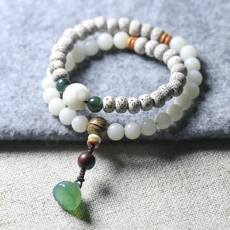 Chinese style green agate lotus and white bodhi root, star and moon bodhi multi-circle women’s bracelet, Buddhist bead hanging chain