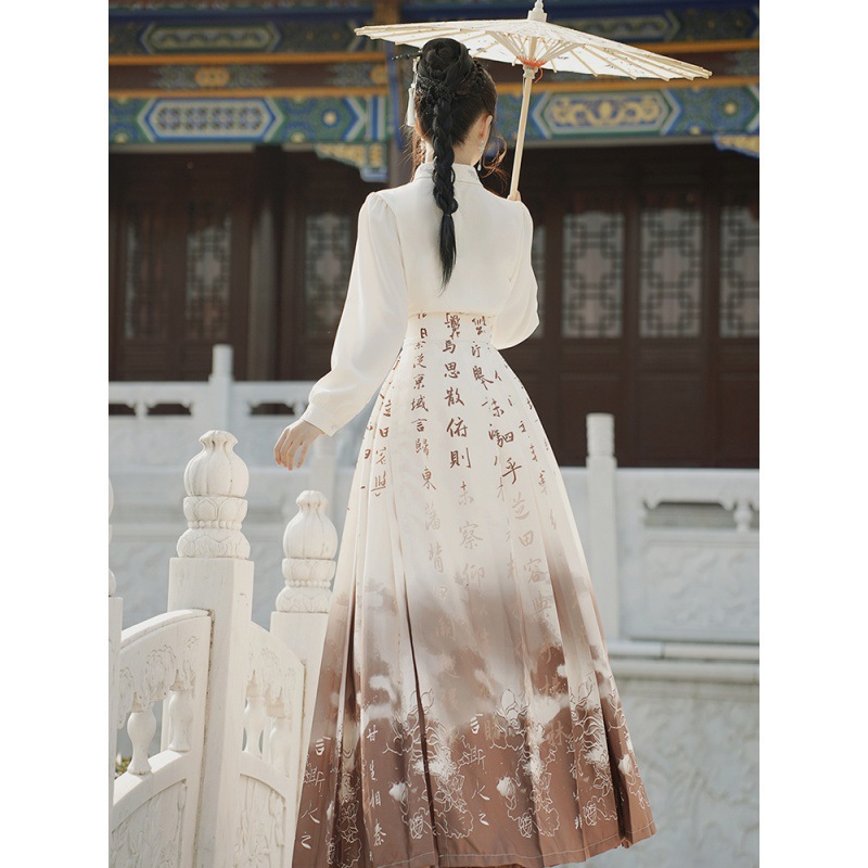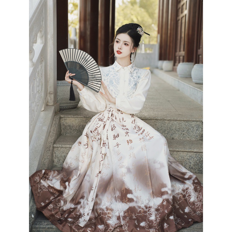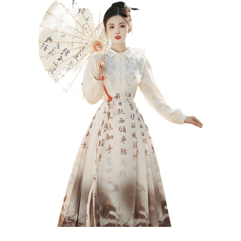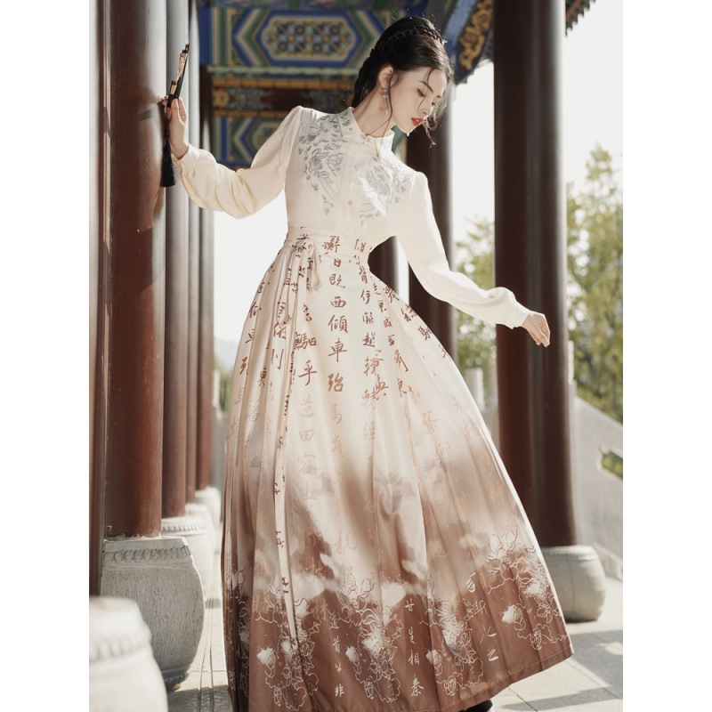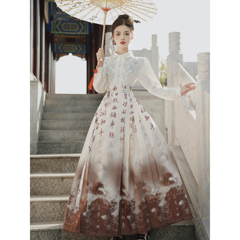Chinese Style Hanfu Embroidered Long Sleeve Chinese Style Ancient Text Gradient Maillard Style Horse Face Dress