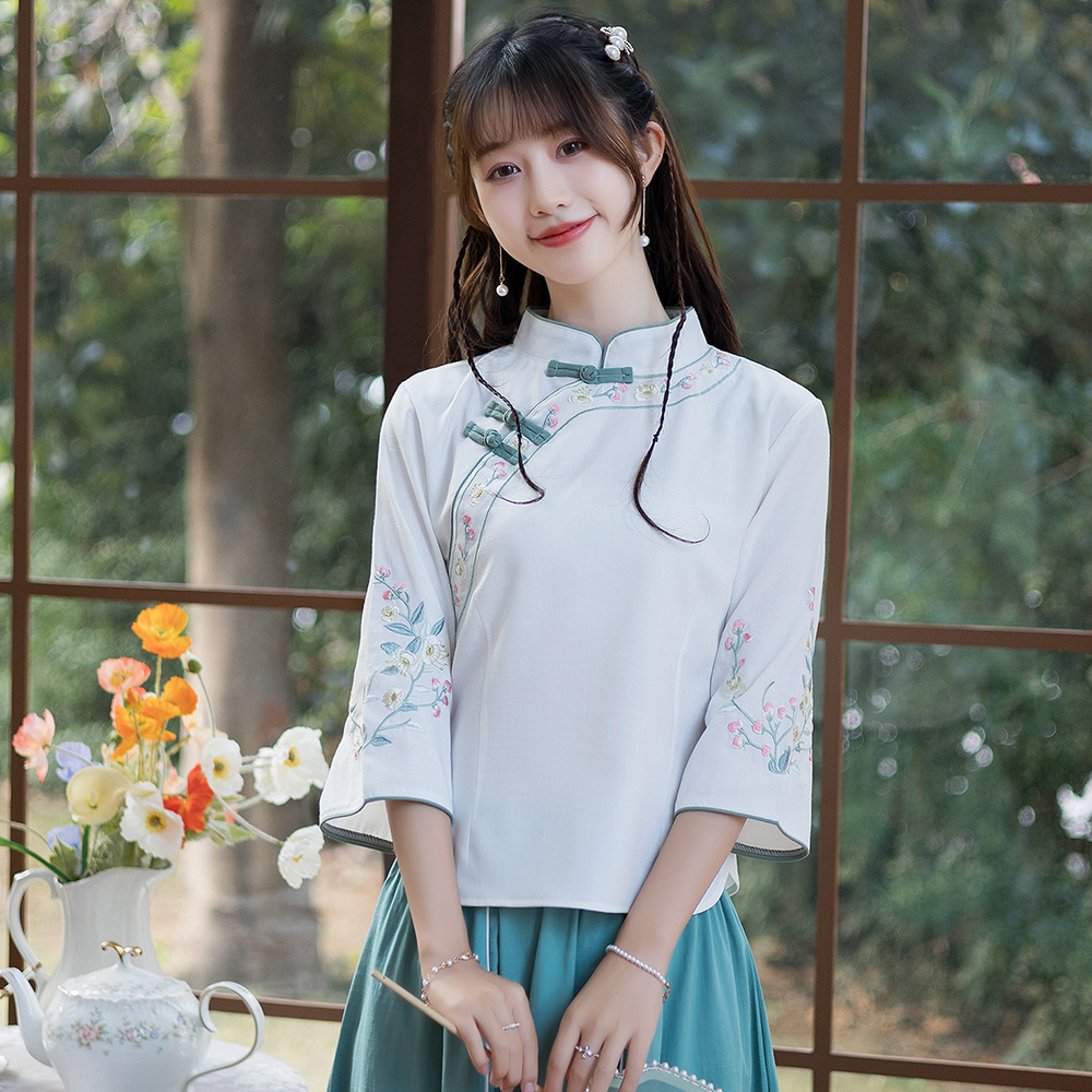 | nameOriginal | Chinese Style Literary Zen Clothing Ethnic Style Cotton and Linen Embroidered Vertical Collar Slim-fit Retro Literary Tea Clothing Top Two-piece Set |
