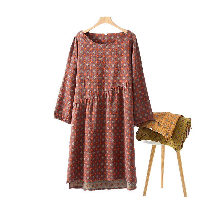 | nameOriginal | Chinese Style National Style Cotton Double-Layer Gauze Spring and Autumn Summer Long Nightgown Women's Vintage Printed Round Neck Home Dress |