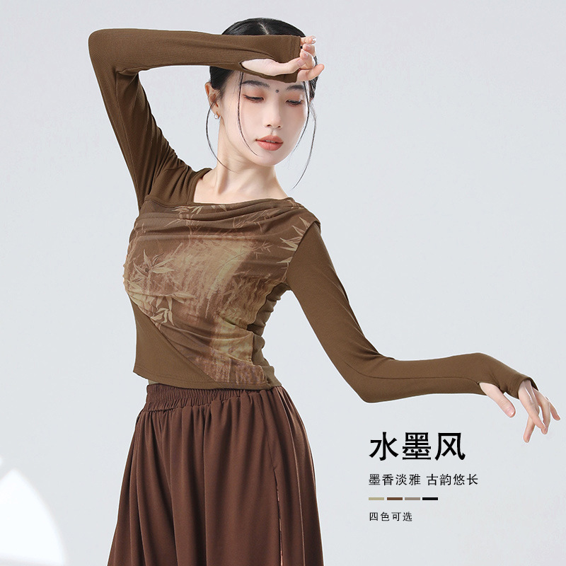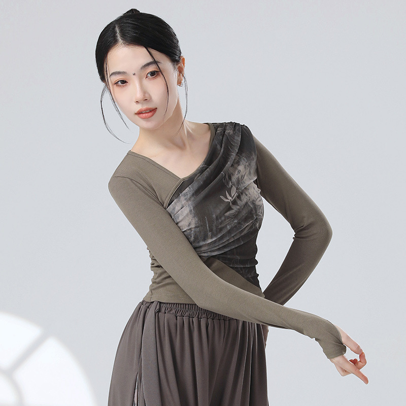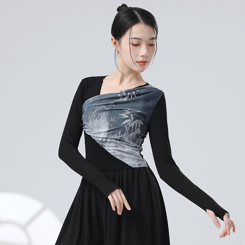 | nameOriginal | Chinese Style New Chinese style stitching ink water yarn oblique collar design sense long sleeve finger set modern dance dance practice body clothes |