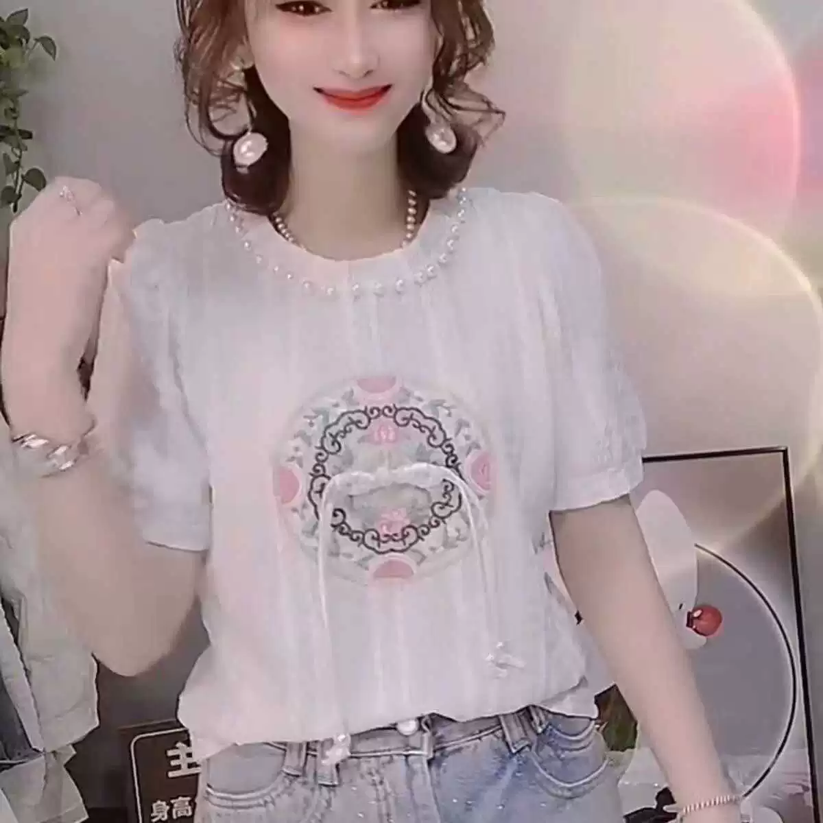 | nameOriginal | Chinese style short-sleeved heavy-duty beaded and diamond-embroidered top |