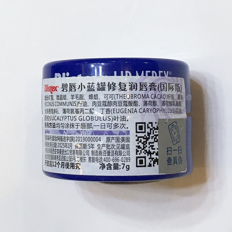 | nameOriginal | Chinese with anti-counterfeiting Blistex/Bailei suitable blue lip small blue can lip balm moisturizing base lip film 7g |
