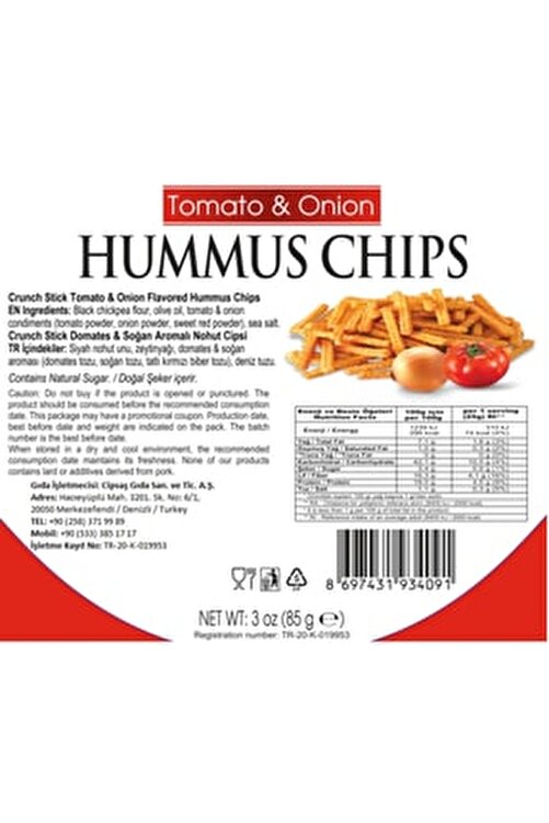 Crunch Stick Tomato & Onion Flavored Hummus Chips 85 g Our products are baked, olive oil, vegan and gluten-free chickpea chips. Black chickpea flour contained in it has a rich fiber content. The manufacturer and brand owner of Crunch Stick and Crunch Wavy chickpea chips is Cipsaş Gıda Sanayi ve Ticaret Anonim Company.