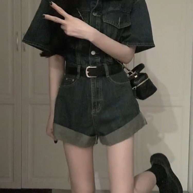 Chubby Girl American retro loose Denim jumpsuit women's summer plus size hot girl waist slimming wide leg shorts