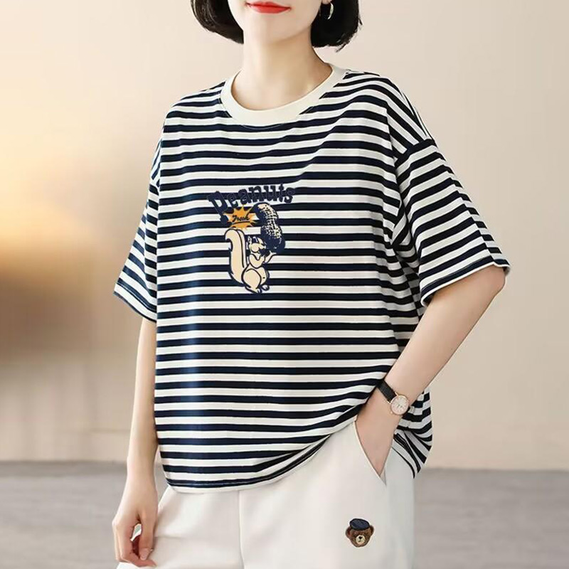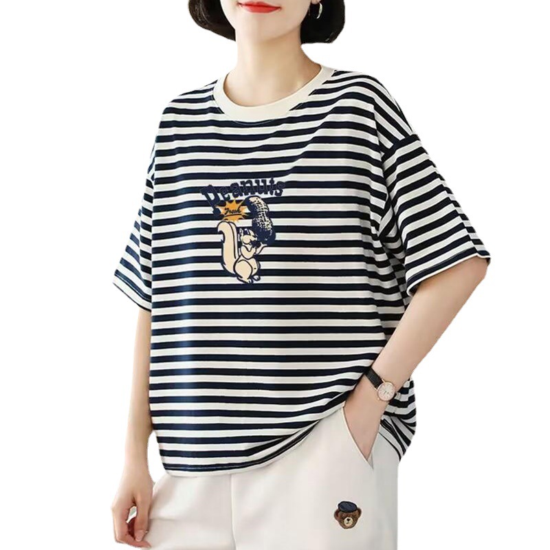 chubby girl plus size Women's Loose Belly-Covering Slimming T-shirt 2024 New Summer Mother Striped Short-Sleeved Top for Women