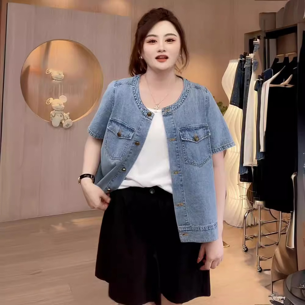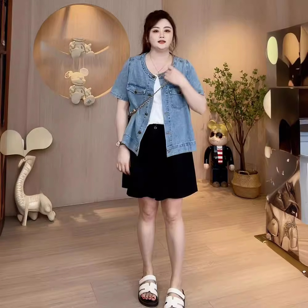 | nameOriginal | Chubby Plus Size Design Sense Retro Short-sleeved T-shirt Denim Top Women's Summer chubby girl Loose Slimming Small Fragrant Coat |
