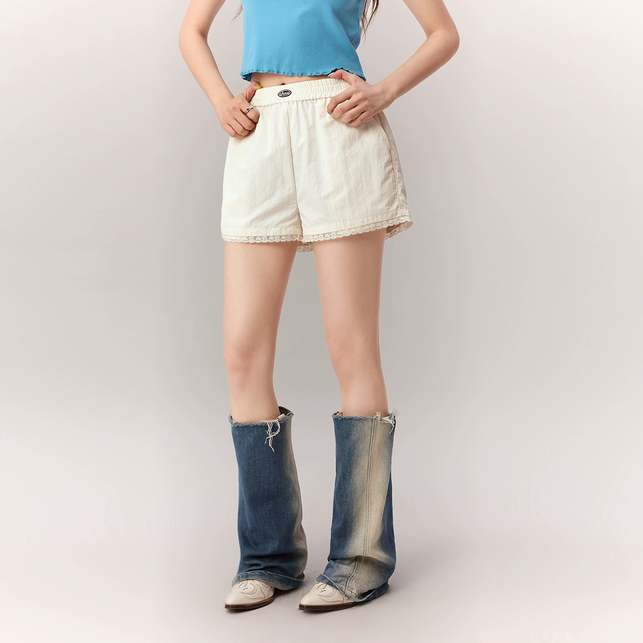 | nameOriginal | CHUU patchwork elastic waist sports shorts with lace trim |