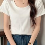 Classic basic U-collar Gray all-match short-sleeved T-shirt Women’s American-style slim-fit slimming half-sleeve top low collar bottoming shirt